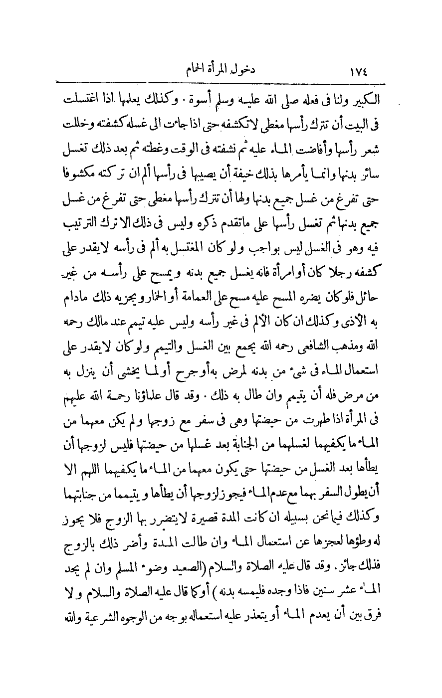 وَكَذَلِكَ يُعَلِّمُهَا إذَا اغْتَسَلَتْ فِي الْبَيْتِ أَنْ تَتْرُكَ رَأْسَهَا مُغَطًّى لَا تَكْشِفُهُ حَتَّى إذَا جَاءَتْ إلَى غَسْلِهِ كَشَفَتْهُ، وَخَلَّلَتْ شَعْرَ رَأْسِهَا، وَأَفَاضَتْ الْمَاءَ عَلَيْهِ ثُمَّ نَشَّفَتْهُ فِي الْوَقْتِ، وَغَطَّتْهُ ثُمَّ بَعْدَ ذَلِكَ تَغْسِلُ سَائِرَ بَدَنِهَا، وَإِنَّمَا يَأْمُرُهَا بِذَلِكَ خِيفَةَ أَنْ يُصِيبَهَا فِي رَأْسِهَا أَلَمٌ إنْ تَرَكَتْهُ مَكْشُوفًا حَتَّى تَفْرُغَ مِنْ غُسْلِ جَمِيعِ بَدَنِهَا، وَلَهَا أَنْ تَتْرُكَ رَأْسَهَا مُغَطًّى حَتَّى تَفْرُغَ مِنْ غَسْلِ جَمِيعِ بَدَنِهَا، ثُمَّ تَغْسِلَ رَأْسَهَا عَلَى مَا تَقَدَّمَ ذِكْرُهُ، وَلَيْسَ فِي ذَلِكَ إلَّا تَرْكُ التَّرْتِيبِ فِيهِ، وَهُوَ فِي الْغُسْلِ لَيْسَ بِوَاجِبٍ، وَلَوْ كَانَ الْمُغْتَسِلُ بِهِ أَلَمٌ فِي رَأْسِهِ لَا يَقْدِرُ عَلَى كَشْفِهِ رَجُلًا كَانَ أَوْ امْرَأَةً فَإِنَّهُ يَغْسِلُ جَمِيعَ بَدَنِهِ، وَيَمْسَحُ عَلَى رَأْسِهِ مِنْ غَيْرِ حَائِلٍ، فَلَوْ كَانَ يَضُرُّهُ الْمَسْحُ عَلَيْهِ مَسَحَ عَلَى الْعِمَامَةِ، أَوْ الْخِمَارِ، وَيُجْزِيهِ ذَلِكَ مَا دَامَ بِهِ الْأَذَى، وَكَذَلِكَ إنْ كَانَ الْأَلَمُ فِي غَيْرِ رَأْسِهِ، وَلَيْسَ عَلَيْهِ تَيَمُّمٌ عِنْدَ مَالِكٍ - رَحِمَهُ اللَّهُ -، وَمَذْهَبُ الشَّافِعِيِّ - رَحِمَهُ اللَّهُ - يَجْمَعُ بَيْنَ الْغُسْلِ وَالتَّيَمُّمِ، وَلَوْ كَانَ لَا يَقْدِرُ عَلَى اسْتِعْمَالِ الْمَاءِ فِي شَيْءٍ مِنْ بَدَنِهِ لِمَرَضٍ بِهِ، أَوْ جُرْحٍ، أَوْ لِمَا يَخْشَى أَنْ يَنْزِلَ بِهِ مِنْ مَرَضٍ فَلَهُ أَنْ يَتَيَمَّمَ، وَإِنْ طَالَ بِهِ ذَلِكَ، وَقَدْ قَالَ عُلَمَاؤُنَا رَحْمَةُ اللَّهِ عَلَيْهِمْ فِي الْمَرْأَةِ إذَا طَهُرَتْ مِنْ حَيْضَتِهَا، وَهِيَ فِي سَفَرٍ مَعَ زَوْجِهَا، وَلَمْ يَكُنْ مَعَهُمَا مِنْ الْمَاءِ مَا يَكْفِيهِمَا لِغُسْلِهِمَا مِنْ الْجَنَابَةِ بَعْدَ غُسْلِهَا مِنْ حَيْضَتِهَا فَلَيْسَ لِزَوْجِهَا أَنْ يَطَأَهَا بَعْدَ الْغُسْلِ مِنْ حَيْضَتِهَا، حَتَّى يَكُونَ مَعَهُمَا مِنْ الْمَاءِ مَا يَكْفِيهِمَا اللَّهُمَّ إلَّا أَنْ يَطُولَ السَّفَرُ بِهِمَا مَعَ عَدَمِ الْمَاءِ فَيَجُوزُ لِزَوْجِهَا أَنْ يَطَأَهَا، وَيَتَيَمَّمَا مِنْ جَنَابَتِهِمَا، وَكَذَلِكَ فِيمَا نَحْنُ بِسَبِيلِهِ إنْ كَانَتْ الْمُدَّةُ قَصِيرَةً لَا يَتَضَرَّرُ بِهَا الزَّوْجُ فَلَا يَجُوزُ لَهُ وَطْؤُهَا؛ لِعَجْزِهَا عَنْ اسْتِعْمَالِ الْمَاءِ، وَإِنْ طَالَتْ الْمُدَّةُ، وَأَضَرَّ ذَلِكَ بِالزَّوْجِ فَذَلِكَ جَائِزٌ.