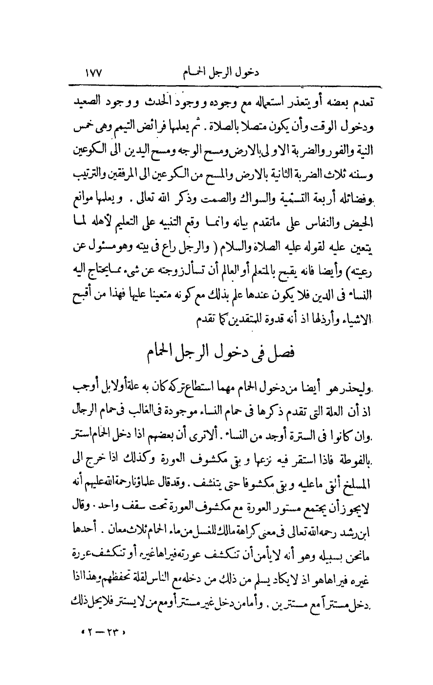 ، فَصْلٌ فِي دُخُولِ الرَّجُلِ الْحَمَّامَ وَلْيَحْذَرْ هُوَ أَيْضًا مِنْ دُخُولِ الْحَمَّامِ مَهْمَا اسْتَطَاعَ تَرْكَهُ، كَانَ بِهِ عِلَّةٌ أَوْ لَا، بَلْ أَوْجَبُ إذْ أَنَّ الْعِلَّةَ الَّتِي تَقَدَّمَ ذِكْرُهَا فِي حَمَّامِ النِّسَاءِ مَوْجُودَةٌ فِي الْغَالِبِ فِي حَمَّامِ الرِّجَالِ، وَإِنْ كَانُوا فِي السُّتْرَةِ أَوْجَدَ مِنْ النِّسَاءِ.