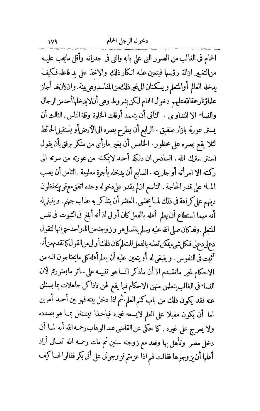 الْحَمَّامِ فِي الْغَالِبِ مِنْ الصُّوَرِ الَّتِي عَلَى بَابِهِ، وَاَلَّتِي فِي جُدْرَانِهِ، وَأَقَلُّ مَا يَجِبُ عَلَيْهِ مِنْ التَّغْيِيرِ إزَالَةُ رُءُوسِهَا فَيَتَعَيَّنُ عَلَيْهِ إنْكَارُ ذَلِكَ، وَالْأَخْذُ عَلَى يَدِ فَاعِلِهِ فَكَيْفَ يَدْخُلُهُ الْعَالِمُ أَوْ الْمُتَعَلِّمُ، وَيَسْكُتَانِ؟ إلَى غَيْرِ ذَلِكَ مِنْ الْمَفَاسِدِ، وَهِيَ بَيِّنَةٌ، وَإِنْ كَانَ قَدْ أَجَازَ عُلَمَاؤُنَا رَحْمَةُ اللَّهِ عَلَيْهِمْ دُخُولَ الْحَمَّامِ لَكِنْ بِشُرُوطٍ، وَهِيَ: