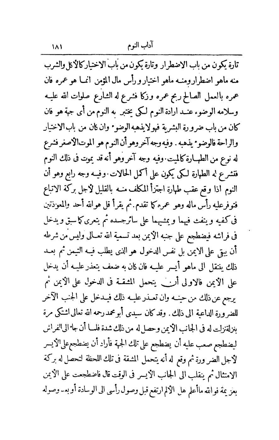 تَارَةً يَكُونُ مِنْ بَابِ الِاضْطِرَارِ، وَتَارَةً يَكُونُ مِنْ بَابِ الِاخْتِيَارِ كَالْأَكْلِ وَالشُّرْبِ مِنْهُ مَا هُوَ اضْطِرَارٌ، وَمِنْهُ مَا هُوَ اخْتِيَارٌ، وَرَأْسُ مَالِ الْمُؤْمِنِ إنَّمَا هُوَ عُمُرُهُ، فَإِنْ عَمَّرَهُ بِالْعَمَلِ الصَّالِحِ رَبِحَ عُمُرَهُ، وَزَكَا فَشَرَعَ لَهُ الشَّارِعُ صَلَوَاتُ اللَّهِ عَلَيْهِ وَسَلَامُهُ الْوُضُوءَ عِنْدَ إرَادَةِ النَّوْمِ، لِكَيْ يَخْتَبِرَ بِهِ النَّوْمَ مِنْ أَيِّ جِهَةٍ هُوَ، فَإِنْ كَانَ مِنْ بَابِ ضَرُورَةِ الْبَشَرِيَّةِ فَهُوَ لَا يُذْهِبُهُ الْوُضُوءُ، وَإِنْ كَانَ مِنْ بَابِ الِاخْتِيَارِ وَالرَّاحَةِ فَالْوُضُوءُ يُذْهِبُهُ، وَفِيهِ وَجْهٌ آخَرُ، وَهُوَ: أَنَّ النَّوْمَ هُوَ الْمَوْتُ الْأَصْغَرُ فَشُرِعَ لَهُ نَوْعٌ مِنْ الطَّهَارَةِ كَالْمَيِّتِ، وَفِيهِ وَجْهٌ آخَرُ: وَهُوَ أَنَّهُ قَدْ يَمُوتُ فِي ذَلِكَ النَّوْمِ فَتُشْرَعُ لَهُ الطَّهَارَةُ لِكَيْ يَكُونَ عَلَى أَكْمَلِ الْحَالَاتِ، وَفِيهِ وَجْهٌ رَابِعٌ: وَهُوَ أَنَّ النَّوْمَ إذَا وَقَعَ عَقِبَ طَهَارَةٍ اجْتَزَأَ الْمُكَلَّفُ مِنْهُ بِالْقَلِيلِ لِأَجْلِ بَرَكَةِ الِاتِّبَاعِ فَتَوَفَّرَ عَلَيْهِ رَأْسُ مَالِهِ، وَهُوَ عُمُرُهُ كَمَا تَقَدَّمَ.