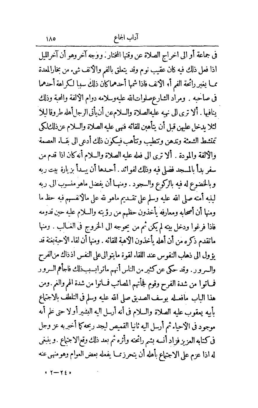 أَلَا تَرَى إلَى نَهْيِهِ - عَلَيْهِ الصَّلَاةُ وَالسَّلَامُ - عَنْ أَنْ يَأْتِيَ الرَّجُلُ أَهْلَهُ طُرُوقًا لَيْلًا لِئَلَّا يَدْخُلَ عَلَيْهِنَّ قَبْلَ أَنْ يَتَأَهَّبْنَ لِلِقَائِهِ، فَنَهَى - عَلَيْهِ الصَّلَاةُ وَالسَّلَامُ - عَنْ ذَلِكَ لِكَيْ تَمْتَشِطَ الشَّعِثَةُ وَتَدْهُنَ وَتَتَطَيَّبَ وَتَتَأَهَّبَ، فَيَكُونَ ذَلِكَ أَدْعَى إلَى بَقَاءِ الْعِصْمَةِ وَالْأُلْفَةِ وَالْمَوَدَّةِ، أَلَا تَرَى إلَى فِعْلِهِ - عَلَيْهِ الصَّلَاةُ وَالسَّلَامُ - أَنَّهُ كَانَ إذَا قَدِمَ مِنْ سَفَرٍ بَدَأَ بِالْمَسْجِدِ فَصَلَّى فِيهِ، وَذَلِكَ لِفَوَائِدَ. أَحَدُهَا: أَنْ يَبْدَأَ بِزِيَارَةِ بَيْتِ رَبِّهِ، وَبِالْخُضُوعِ لَهُ فِيهِ بِالرُّكُوعِ، وَالسُّجُودِ، وَمِنْهَا أَنْ يُفَضِّلَ مَا هُوَ مَنْسُوبٌ إلَى رَبِّهِ لِيُنَبِّهَ أُمَّتَهُ - صَلَّى اللَّهُ عَلَيْهِ وَسَلَّمَ - عَلَى تَقْدِيمِ مَا هُوَ لِلَّهِ عَلَى مَا لِأَنْفُسِهِمْ فِيهِ حَظٌّ مَا، وَمِنْهَا أَنَّ أَصْحَابَهُ وَمَعَارِفَهُ يَأْخُذُونَ حَظَّهُمْ مِنْ رُؤْيَتِهِ وَالسَّلَامِ عَلَيْهِ حِينَ قُدُومِهِ، فَإِذَا فَرَغُوا، وَدَخَلَ بَيْتَهُ " لَمْ يَكُنْ ثَمَّ مَنْ يُحْوِجُهُ إلَى الْخُرُوجِ فِي الْغَالِبِ، وَمِنْهَا مَا تَقَدَّمَ ذِكْرُهُ مِنْ أَنَّ أَهْلَهُ يَأْخُذُونَ الْأُهْبَةَ لِلِقَائِهِ، وَمِنْهَا أَنَّ لِقَاءَ الْأَحِبَّةِ بَغْتَةً قَدْ يَئُولُ إلَى ذَهَابِ النُّفُوسِ عِنْدَ اللِّقَاءِ لِقُوَّةِ مَا يَتَوَالَى عَلَى النَّفْسِ إذْ ذَاكَ مِنْ الْفَرَحِ وَالسُّرُورِ. وَقَدْ حُكِيَ عَنْ كَثِيرٍ مِنْ النَّاسِ أَنَّهُمْ مَاتُوا بِسَبَبِ ذَلِكَ فَاجَأَهُمْ السُّرُورُ فَمَاتُوا مِنْ شِدَّةِ الْفَرَحِ، وَقَوْمٌ فَجَأَتْهُمْ الْمَصَائِبُ فَمَاتُوا مِنْ شِدَّةِ الْهَمِّ وَالْغَمِّ. وَمِنْ هَذَا الْبَابِ مَا فَعَلَهُ يُوسُفُ الصِّدِّيقُ - صَلَّى اللَّهُ عَلَيْهِ وَسَلَّمَ - فِي التَّلَطُّفِ بِالِاجْتِمَاعِ بِأَبِيهِ يَعْقُوبَ - عَلَيْهِ الصَّلَاةُ وَالسَّلَامُ - فِي أَنَّهُ أَرْسَلَ إلَيْهِ الْبَشِيرَ أَوَّلًا حَتَّى عَلِمَ أَنَّهُ مَوْجُودٌ فِي الْأَحْيَاءِ، ثُمَّ أَرْسَلَ إلَيْهِ ثَانِيًا الْقَمِيصَ لِيَجِدَ رِيحَهُ كَمَا أَخْبَرَ بِهِ عَزَّ وَجَلَّ فِي كِتَابِهِ الْعَزِيزِ فَزَادَ أُنْسُهُ بِشَمِّ رَائِحَتِهِ وَأَثَرِهِ، ثُمَّ بَعْدَ ذَلِكَ وَقَعَ الِاجْتِمَاعُ، وَيَنْبَغِي لَهُ إذَا عَزَمَ عَلَى الِاجْتِمَاعِ بِأَهْلِهِ أَنْ يَتَحَرَّزَ مِمَّا يَفْعَلُهُ بَعْضُ الْعَوَامّ، وَهُوَ مَنْهِيٌّ عَنْهُ