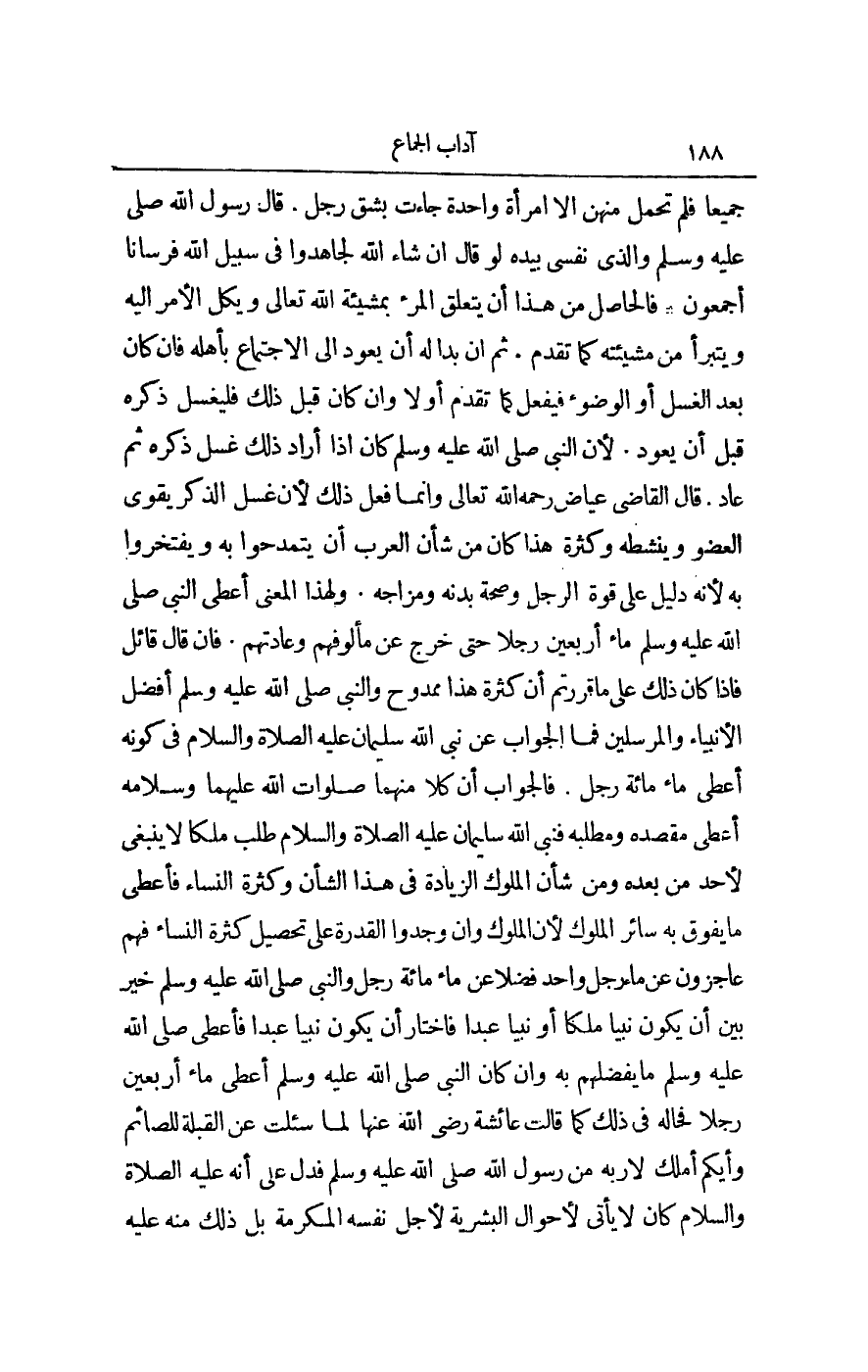 ثُمَّ إنْ بَدَا لَهُ أَنْ يَعُودَ إلَى الِاجْتِمَاعِ بِأَهْلِهِ، فَإِنْ كَانَ بَعْدَ الْغُسْلِ أَوْ الْوُضُوءِ فَيَفْعَلُ كَمَا تَقَدَّمَ أَوَّلًا، وَإِنْ كَانَ قَبْلَ ذَلِكَ فَلْيَغْسِلْ ذَكَرَهُ قَبْلَ أَنْ يَعُودَ؛ لِأَنَّ النَّبِيَّ - عَلَيْهِ الصَّلَاةُ وَالسَّلَامُ - كَانَ إذَا أَرَادَ ذَلِكَ غَسَلَ ذَكَرَهُ ثُمَّ عَادَ، قَالَ الْقَاضِي عِيَاضٌ - رَحِمَهُ اللَّهُ تَعَالَى -: وَإِنَّمَا فَعَلَ ذَلِكَ؛ لِأَنَّ غَسْلَ الذَّكَرِ يُقَوِّي الْعُضْوَ وَيُنَشِّطُهُ، وَكَثْرَةُ هَذَا كَانَ مِنْ شَأْنِ الْعَرَبِ أَنْ يَتَمَدَّحُوا بِهِ، وَيَفْتَخِرُوا بِهِ؛ لِأَنَّهُ دَلِيلٌ عَلَى قُوَّةِ الرَّجُلِ، وَصِحَّةِ بَدَنِهِ، وَمِزَاجِهِ، وَلِهَذَا الْمَعْنَى أُعْطِيَ النَّبِيُّ - صَلَّى اللَّهُ عَلَيْهِ وَسَلَّمَ - مَاءَ أَرْبَعِينَ رَجُلًا حَتَّى خَرَجَ عَنْ مَأْلُوفِهِمْ، وَعَادَتِهِمْ، فَإِنْ قَالَ قَائِلٌ: فَإِذَا كَانَ ذَلِكَ عَلَى مَا قَرَّرْتُمْ أَنَّ كَثْرَةَ هَذَا مَمْدُوحٌ، وَالنَّبِيُّ - صَلَّى اللَّهُ عَلَيْهِ وَسَلَّمَ - أَفْضَلُ الْأَنْبِيَاءِ وَالْمُرْسَلِينَ، فَمَا الْجَوَابُ عَنْ نَبِيِّ اللَّهِ سُلَيْمَانَ - عَلَيْهِ الصَّلَاةُ وَالسَّلَامُ - فِي كَوْنِهِ أُعْطِيَ مَاءَ مِائَةِ رَجُلٍ؟ فَالْجَوَابُ: أَنَّ كُلًّا مِنْهُمَا صَلَوَاتُ اللَّهِ عَلَيْهِمَا وَسَلَامُهُ أُعْطِيَ مَقْصِدَهُ وَمَطْلَبَهُ، فَنَبِيُّ اللَّهِ سُلَيْمَانُ - عَلَيْهِ الصَّلَاةُ وَالسَّلَامُ - طَلَبَ مُلْكًا لَا يَنْبَغِي لِأَحَدٍ مِنْ بَعْدِهِ، وَمِنْ شَأْنِ الْمُلُوكِ الزِّيَادَةُ فِي هَذَا الشَّأْنِ، وَكَثْرَةُ النِّسَاءِ فَأُعْطِيَ مَا يَفُوقُ بِهِ سَائِرَ الْمُلُوكِ؛ لِأَنَّ الْمُلُوكَ وَإِنْ وَجَدُوا الْقُدْرَةَ عَلَى تَحْصِيلِ كَثْرَةِ النِّسَاءِ فَهُمْ عَاجِزُونَ عَنْ مَاءِ رَجُلٍ وَاحِدٍ فَضْلًا عَنْ مَاءِ مِائَةِ رَجُلٍ.