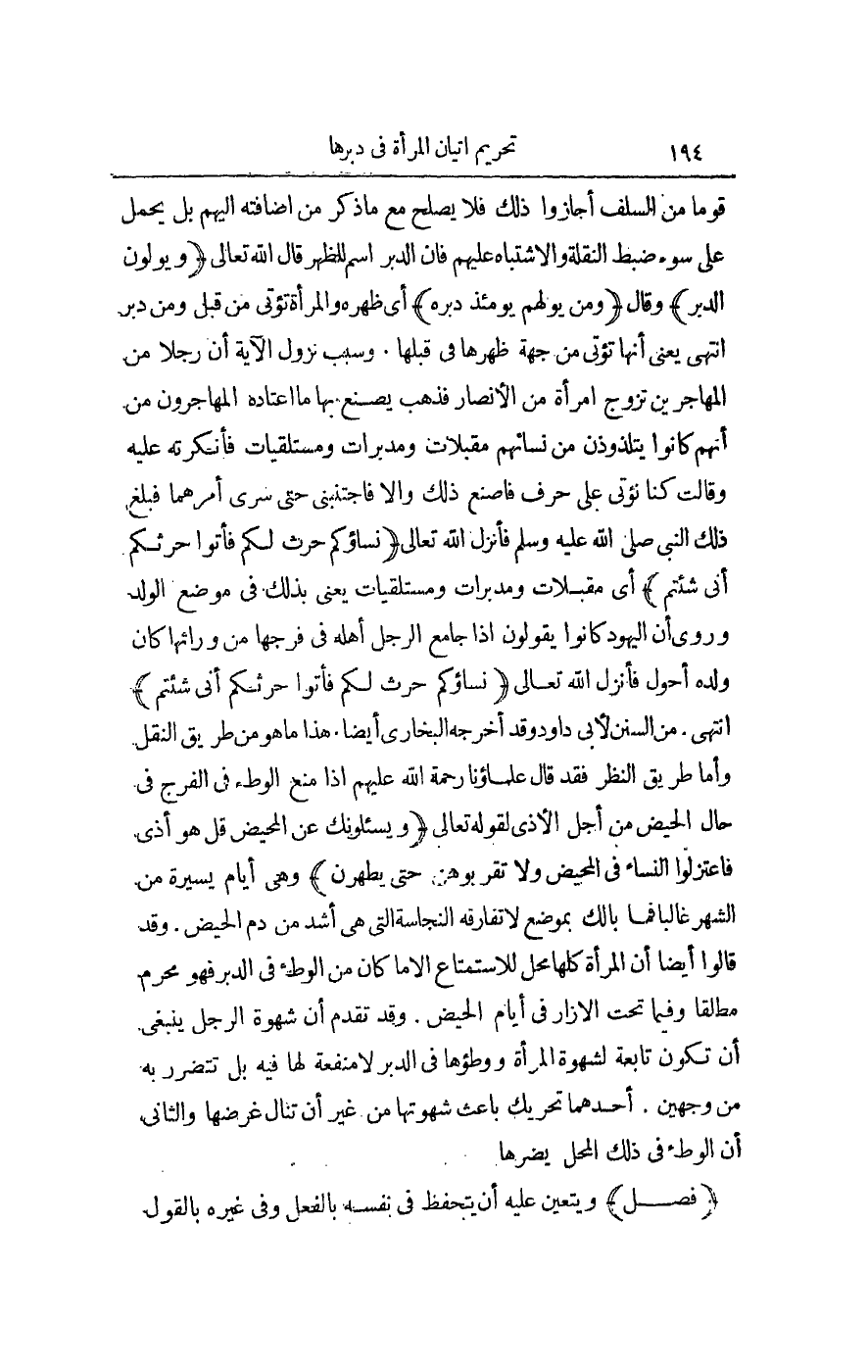 قَوْمًا مِنْ السَّلَفِ أَجَازُوا ذَلِكَ، فَلَا يَصْلُحُ مَعَ مَا ذُكِرَ مِنْ إضَافَتِهِ إلَيْهِمْ بَلْ يُحْمَلُ عَلَى سُوءِ ضَبْطِ النَّقَلَةِ، وَالِاشْتِبَاهِ عَلَيْهِمْ، فَإِنَّ الدُّبُرَ اسْمٌ لِلظَّهْرِ قَالَ اللَّهُ تَعَالَى {وَيُوَلُّونَ الدُّبُرَ} [القمر: 45] ، وَقَالَ {وَمَنْ يُوَلِّهِمْ يَوْمَئِذٍ دُبُرَهُ} [الأنفال: 16] أَيْ ظَهْرَهُ، وَالْمَرْأَةُ تُؤْتَى مِنْ قُبُلٍ، وَمِنْ دُبُرٍ انْتَهَى. يَعْنِي أَنَّهَا تُؤْتَى مِنْ جِهَةِ ظَهْرِهَا فِي قُبُلِهَا، وَسَبَبُ نُزُولِ الْآيَةِ أَنَّ رَجُلًا مِنْ الْمُهَاجِرِينَ تَزَوَّجَ امْرَأَةً مِنْ الْأَنْصَارِ فَذَهَبَ يَصْنَعُ بِهَا مَا اعْتَادَهُ الْمُهَاجِرُونَ مِنْ أَنَّهُمْ كَانُوا يَتَلَذَّذُونَ مِنْ نِسَائِهِمْ مُقْبِلَاتٍ، وَمُدْبِرَاتٍ، وَمُسْتَلْقِيَاتٍ فَأَنْكَرَتْهُ عَلَيْهِ، وَقَالَتْ: كُنَّا نُؤْتَى عَلَى حَرْفٍ فَاصْنَعْ ذَلِكَ، وَإِلَّا فَاجْتَنِبْنِي حَتَّى سَرَى أَمْرُهُمَا فَبَلَغَ ذَلِكَ النَّبِيَّ - صَلَّى اللَّهُ عَلَيْهِ وَسَلَّمَ - فَأَنْزَلَ اللَّهُ تَعَالَى {نِسَاؤُكُمْ حَرْثٌ لَكُمْ فَأْتُوا حَرْثَكُمْ أَنَّى شِئْتُمْ} [البقرة: 223] أَيْ مُقْبِلَاتٍ، وَمُدْبِرَاتٍ، وَمُسْتَلْقِيَاتٍ يَعْنِي بِذَلِكَ فِي مَوْضِعِ الْوَلَدِ.