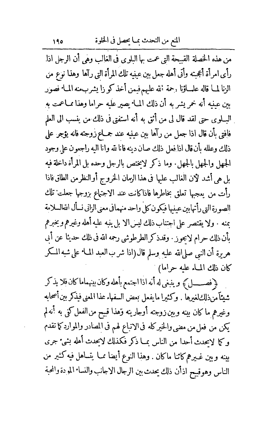 مِنْ هَذِهِ الْخَصْلَةِ الْقَبِيحَةِ الَّتِي عَمَّتْ بِهَا الْبَلْوَى فِي الْغَالِبِ، وَهِيَ أَنَّ الرَّجُلَ إذَا رَأَى امْرَأَةً أَعْجَبَتْهُ، وَأَتَى أَهْلَهُ جَعَلَ بَيْنَ عَيْنَيْهِ تِلْكَ الْمَرْأَةَ الَّتِي رَآهَا، وَهَذَا نَوْعٌ مِنْ الزِّنَا لِمَا قَالَهُ عُلَمَاؤُنَا رَحْمَةُ اللَّهِ عَلَيْهِمْ فِيمَنْ أَخَذَ كُوزًا يَشْرَبُ مِنْهُ الْمَاءَ فَصَوَّرَ بَيْنَ عَيْنَيْهِ أَنَّهُ خَمْرٌ يَشْرَبُهُ أَنَّ ذَلِكَ الْمَاءَ يَصِيرُ عَلَيْهِ حَرَامًا، وَهَذَا مِمَّا عَمَّتْ بِهِ الْبَلْوَى حَتَّى لَقَدْ قَالَ لِي مَنْ أَثِقُ بِهِ: إنَّهُ اسْتَفْتَى فِي ذَلِكَ مَنْ يُنْسَبُ إلَى الْعِلْمِ فَأَفْتَى بِأَنْ قَالَ: إذَا جَعَلَ مَنْ رَآهَا بَيْنَ عَيْنَيْهِ عِنْدَ جِمَاعِ زَوْجَتِهِ فَإِنَّهُ يُؤْجَرُ عَلَى ذَلِكَ، وَعَلَّلَهُ بِأَنْ قَالَ إذَا فَعَلَ ذَلِكَ صَانَ دِينَهُ فَإِنَّا لِلَّهِ وَإِنَّا إلَيْهِ رَاجِعُونَ عَلَى وُجُودِ الْجَهْلِ وَالْجُهَّلِ بِالْجَهْلِ، وَمَا ذُكِرَ لَا يَخْتَصُّ بِالرَّجُلِ وَحْدَهُ بَلْ الْمَرْأَةُ دَاخِلَةٌ فِيهِ بَلْ هِيَ أَشَدُّ؛ لِأَنَّ الْغَالِبَ عَلَيْهَا فِي هَذَا الزَّمَانِ الْخُرُوجُ أَوْ النَّظَرُ مِنْ الطَّاقِ فَإِذَا رَأَتْ مَنْ يُعْجِبُهَا تَعَلَّقَ بِخَاطِرِهَا، فَإِذَا كَانَتْ عِنْدَ الِاجْتِمَاعِ بِزَوْجِهَا جَعَلَتْ تِلْكَ الصُّورَةَ الَّتِي رَأَتْهَا بَيْنَ عَيْنَيْهَا، فَيَكُونُ كُلُّ وَاحِدٍ مِنْهُمَا فِي مَعْنَى الزَّانِي نَسْأَلُ اللَّهَ السَّلَامَةَ بِمَنِّهِ، وَلَا يَقْتَصِرُ عَلَى اجْتِنَابِ ذَلِكَ لَيْسَ إلَّا، بَلْ يُنَبِّهُ عَلَيْهِ أَهْلَهُ وَغَيْرَهُمْ، وَيُخْبِرُهُمْ بِأَنَّ ذَلِكَ حَرَامٌ لَا يَجُوزُ، وَقَدْ ذَكَرَ الطُّرْطُوشِيُّ - رَحِمَهُ اللَّهُ - فِي ذَلِكَ حَدِيثًا عَنْ أَبِي هُرَيْرَةَ أَنَّ النَّبِيَّ - صَلَّى اللَّهُ عَلَيْهِ وَسَلَّمَ - قَالَ: «إذَا شَرِبَ الْعَبْدُ الْمَاءَ عَلَى شَبَهِ الْمُسْكِرِ كَانَ ذَلِكَ الْمَاءُ عَلَيْهِ حَرَامًا»