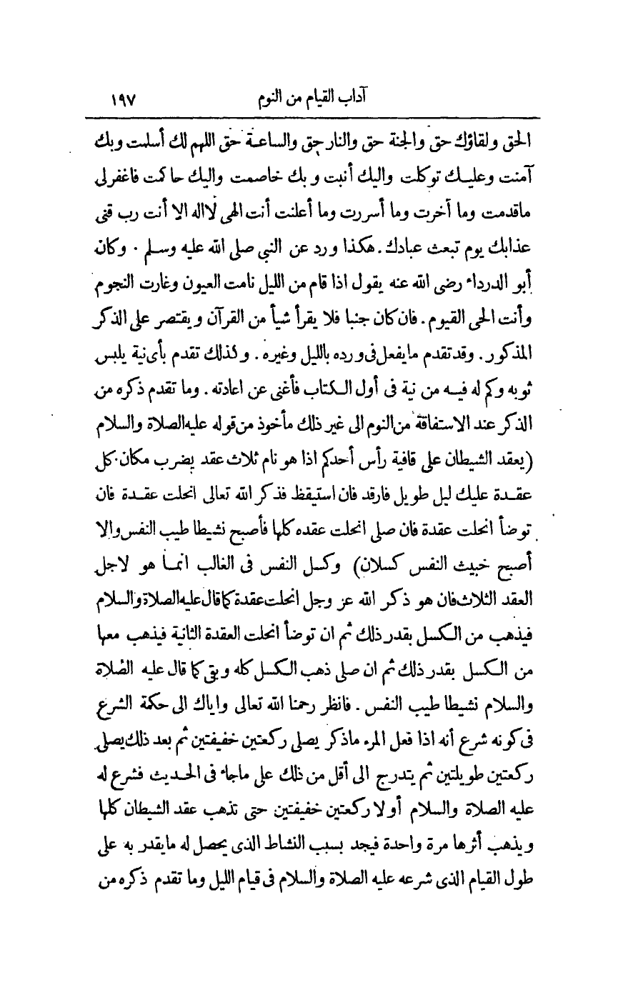 هَكَذَا وَرَدَ عَنْ النَّبِيِّ - صَلَّى اللَّهُ عَلَيْهِ وَسَلَّمَ -.، وَكَانَ أَبُو الدَّرْدَاءِ - رَضِيَ اللَّهُ عَنْهُ - يَقُولُ إذَا قَامَ مِنْ اللَّيْلِ: نَامَتْ الْعُيُونُ، وَغَارَتْ النُّجُومُ، وَأَنْتَ الْحَيُّ الْقَيُّومُ. فَإِنْ كَانَ جُنُبًا فَلَا يَقْرَأُ شَيْئًا مِنْ الْقُرْآنِ، وَيَقْتَصِرُ عَلَى الذِّكْرِ الْمَذْكُورِ، وَقَدْ تَقَدَّمَ مَا يَفْعَلُ فِي وِرْدِهِ بِاللَّيْلِ، وَغَيْرِهِ.