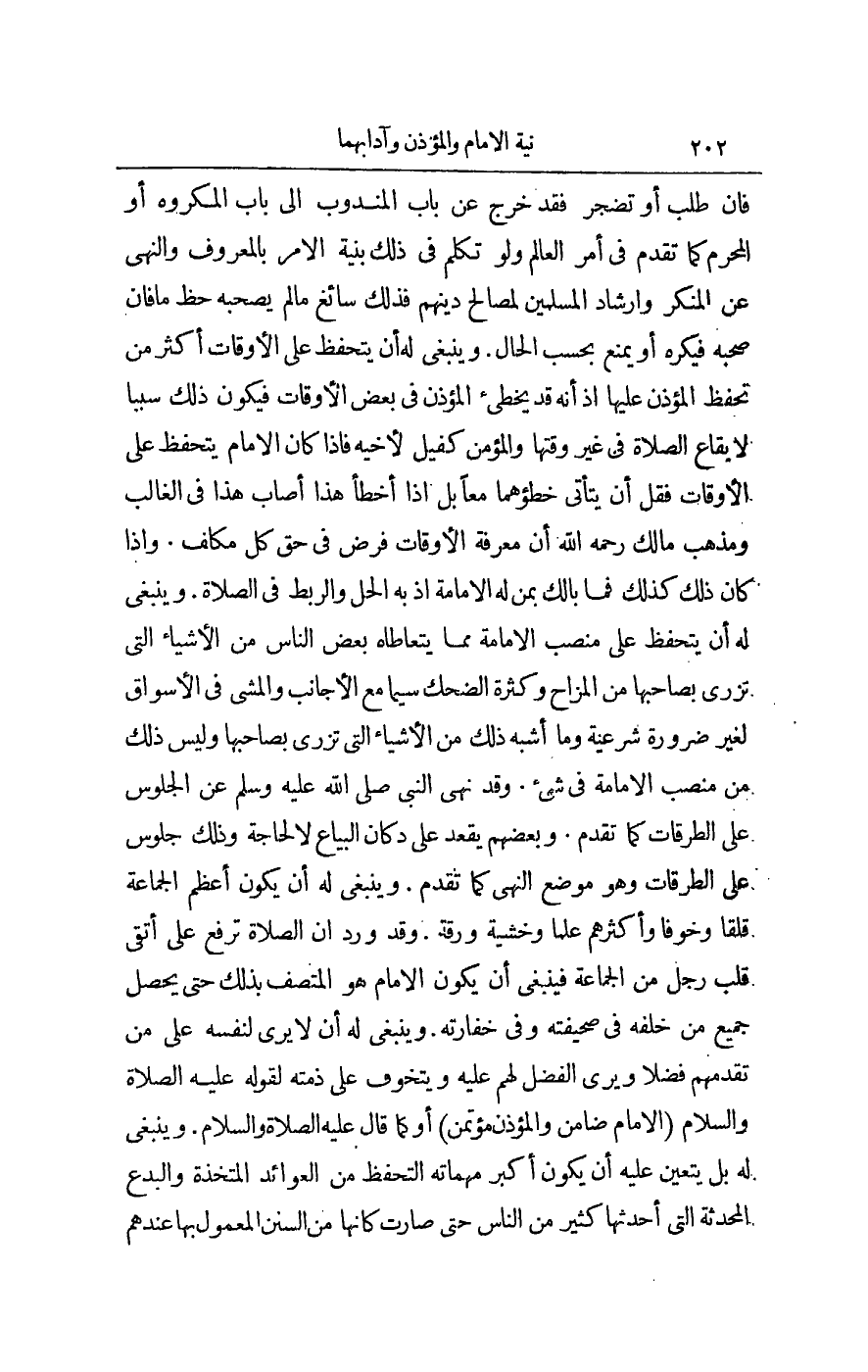 وَقَدْ «نَهَى النَّبِيُّ - صَلَّى اللَّهُ عَلَيْهِ وَسَلَّمَ - عَنْ الْجُلُوسِ عَلَى الطَّرَقَاتِ» كَمَا تَقَدَّمَ، وَبَعْضُهُمْ يَقْعُدُ عَلَى دُكَّانِ الْبَيَّاعِ لَا لِحَاجَةٍ، وَذَلِكَ جُلُوسٌ عَلَى الطُّرُقَاتِ، وَهُوَ مَوْضِعُ النَّهْيِ كَمَا تَقَدَّمَ، وَيَنْبَغِي لَهُ أَنْ يَكُونَ أَعْظَمَ الْجَمَاعَةِ قَلَقًا وَخَوْفًا، وَأَكْثَرَهُمْ عِلْمًا وَخَشْيَةً وَرِقَّةً، وَقَدْ وَرَدَ أَنَّ الصَّلَاةَ تُرْفَعُ عَلَى أَتْقَى قَلْبِ رَجُلٍ مِنْ الْجَمَاعَةِ فَيَنْبَغِي أَنْ يَكُونَ الْإِمَامُ هُوَ الْمُتَّصِفُ بِذَلِكَ حَتَّى يُحَصِّلَ جَمِيعَ مَنْ خَلْفَهُ فِي صَحِيفَتِهِ، وَفِي خِفَارَتِهِ، وَيَنْبَغِي لَهُ أَنْ لَا يَرَى لِنَفْسِهِ عَلَى مَنْ تَقَدَّمَهُمْ فَضْلًا، وَيَرَى الْفَضْلَ لَهُمْ عَلَيْهِ، وَيَتَخَوَّفُ عَلَى ذِمَّتِهِ لِقَوْلِهِ - عَلَيْهِ الصَّلَاةُ وَالسَّلَامُ -: «الْإِمَامُ ضَامِنٌ، وَالْمُؤَذِّنُ مُؤْتَمَنٌ» أَوْ كَمَا قَالَ - عَلَيْهِ الصَّلَاةُ وَالسَّلَامُ -: وَيَنْبَغِي لَهُ بَلْ يَتَعَيَّنُ عَلَيْهِ أَنْ يَكُونَ أَكْبَرُ مُهِمَّاتِهِ التَّحَفُّظَ مِنْ الْعَوَائِدِ الْمُتَّخَذَةِ، وَالْبِدَعِ الْمُحْدَثَةِ الَّتِي أَحْدَثَهَا كَثِيرٌ مِنْ النَّاسِ حَتَّى صَارَتْ كَأَنَّهَا مِنْ السُّنَنِ الْمَعْمُولِ بِهَا عِنْدَهُمْ،