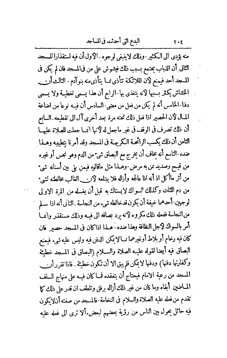فَإِذَا تَقَرَّرَ أَنَّ الْمَسْجِدَ مِنْ رَعِيَّةِ الْإِمَامِ فَيَحْتَاجُ أَنْ يَتَفَقَّدَهُ، فَمَا كَانَ فِيهِ عَلَى مِنْهَاجِ السَّلَفِ الْمَاضِينَ أَبْقَاهُ وَمَا كَانَ مِنْ غَيْرِ ذَلِكَ أَزَالَهُ بِرِفْقٍ وَتَلَطُّفٍ، إنْ قَدَرَ عَلَى ذَلِكَ كَمَا تَقَدَّمَ مِنْ فِعْلِهِ - عَلَيْهِ الصَّلَاةُ وَالسَّلَامُ - فِي النُّخَامَةِ فِي الْمَسْجِدِ مِنْ صِفَتِهِ أَنْ لَا يَكُونَ فِيهِ حَائِلٌ يَحُولُ بَيْنَ النَّاسِ مِنْ رُؤْيَةِ بَعْضِهِمْ لِبَعْضٍ.