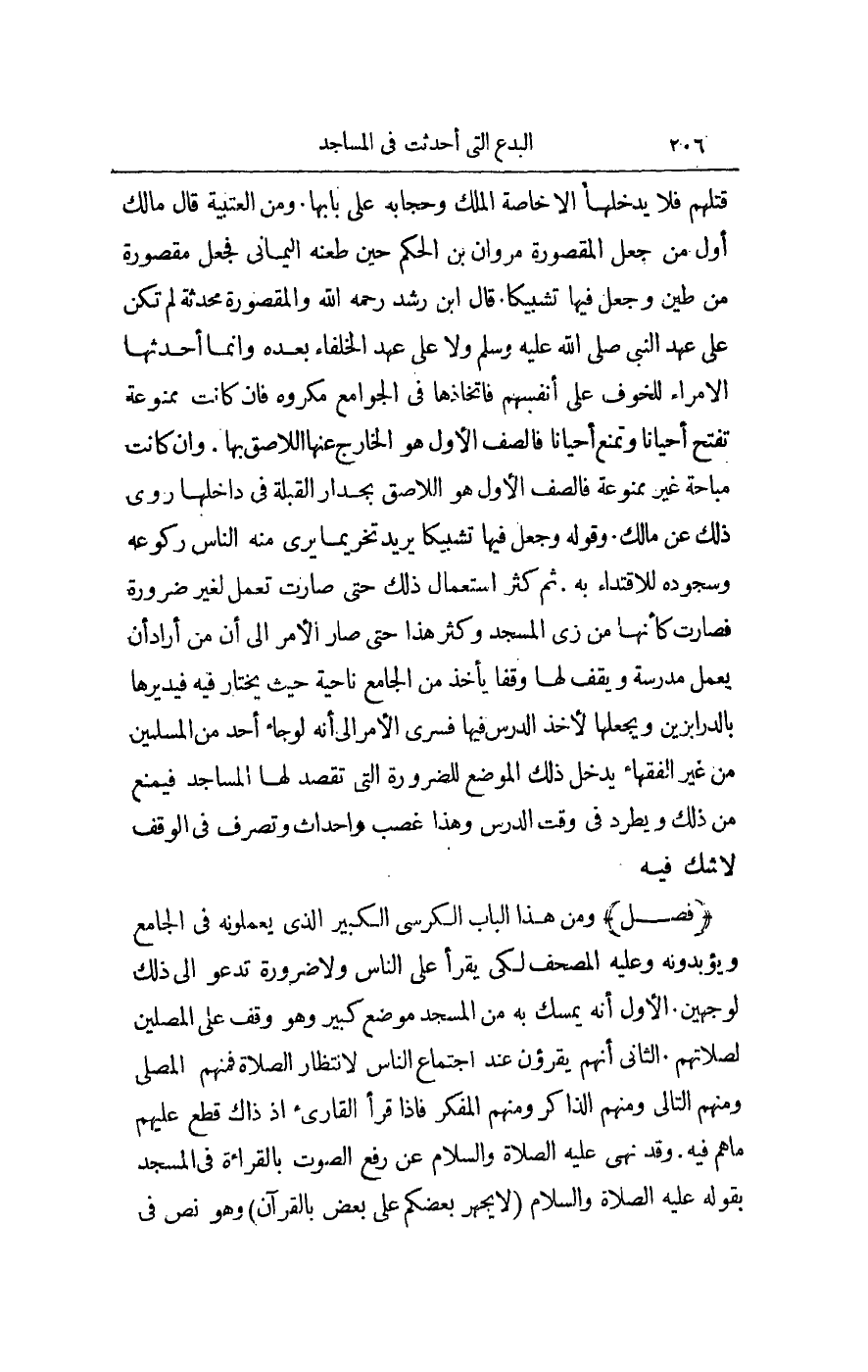 (فَصْلٌ) وَمِنْ هَذَا الْبَابِ الْكُرْسِيُّ الْكَبِيرُ الَّذِي يَعْمَلُونَهُ فِي الْجَامِعِ وَيُؤَبِّدُونَهُ وَعَلَيْهِ الْمُصْحَفُ لِكَيْ يُقْرَأَ عَلَى النَّاسِ، وَلَا ضَرُورَةَ تَدْعُو إلَى ذَلِكَ لِوَجْهَيْنِ: