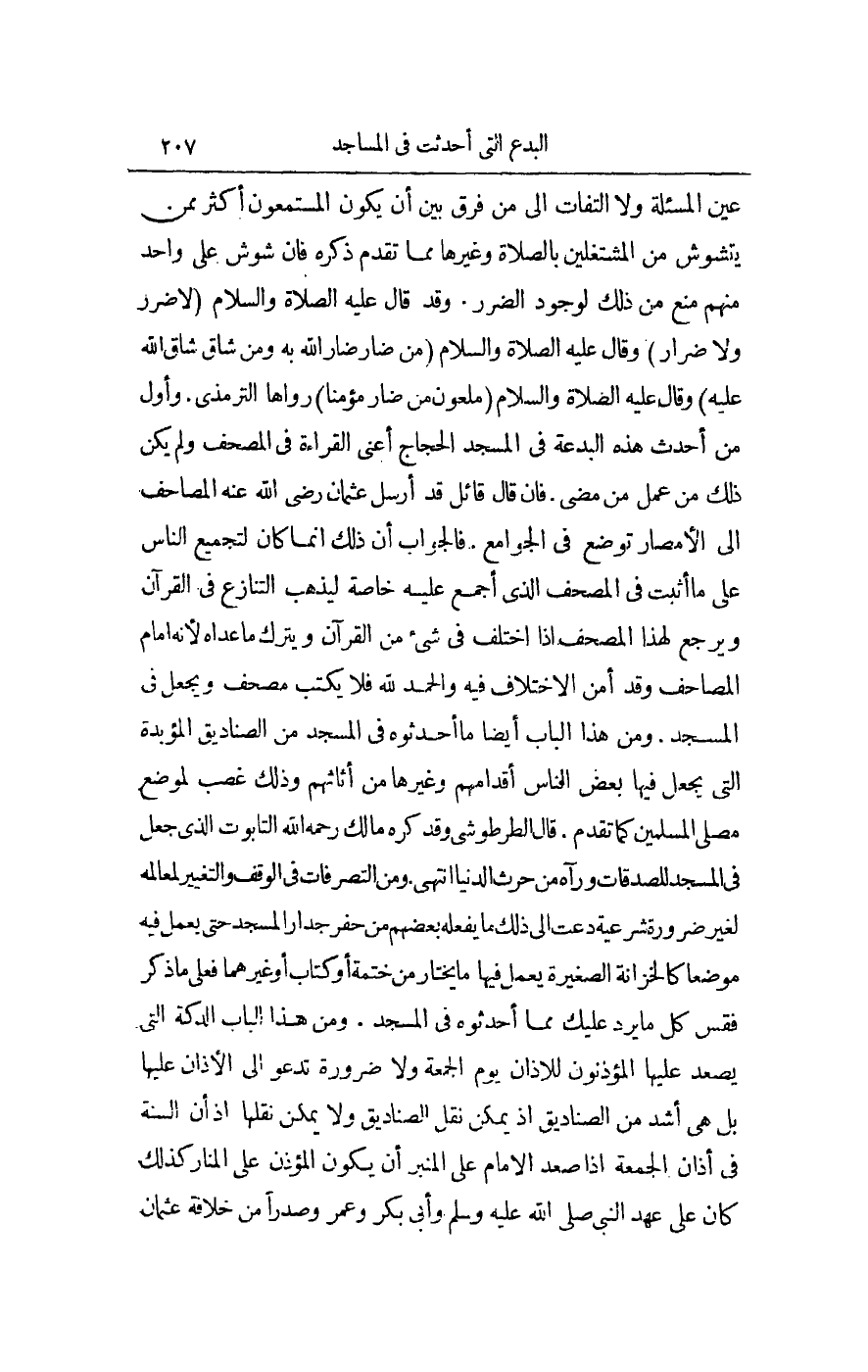 وَمِنْ التَّصَرُّفَاتِ فِي الْوَقْفِ وَالتَّغْيِيرِ لِمَعَالِمِهِ لِغَيْرِ ضَرُورَةٍ شَرْعِيَّةٍ دَعَتْ إلَى ذَلِكَ مَا يَفْعَلُهُ بَعْضُهُمْ مِنْ حَفْرِ جِدَارِ الْمَسْجِدِ حَتَّى يَعْمَلَ فِيهِ مَوْضِعًا كَالْخِزَانَةِ الصَّغِيرَةِ يَعْمَلُ فِيهَا مَا يَخْتَارُ مِنْ خَتْمَةٍ أَوْ كِتَابٍ أَوْ غَيْرِهِمَا، فَعَلَى مَا ذُكِرَ فَقِسْ كُلَّ مَا يَرِدُ عَلَيْكَ مِمَّا أَحْدَثُوهُ فِي الْمَسْجِدِ.