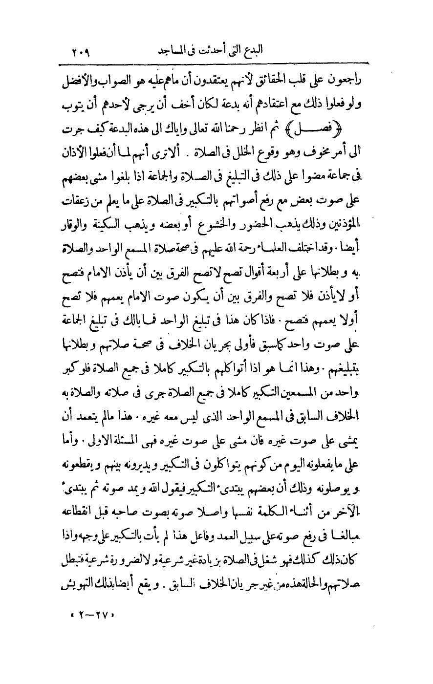 (فَصْلٌ) ثُمَّ اُنْظُرْ رَحِمَنَا اللَّهُ تَعَالَى وَإِيَّاكَ إلَى هَذِهِ الْبِدْعَةِ كَيْفَ جَرَّتْ إلَى أَمْرٍ مَخُوفٍ، وَهُوَ وُقُوعُ الْخَلَلِ فِي الصَّلَاةِ. أَلَا تَرَى أَنَّهُمْ لَمَّا أَنْ فَعَلُوا الْأَذَانَ فِي جَمَاعَةٍ مَضَوْا عَلَى ذَلِكَ التَّبْلِيغِ فِي الصَّلَاةِ وَالْجَمَاعَةِ إذَا بَلَّغُوا مَشَى بَعْضُهُمْ عَلَى صَوْتِ بَعْضٍ مَعَ رَفْعِ أَصْوَاتِهِمْ بِالتَّكْبِيرِ فِي الصَّلَاةِ عَلَى مَا يُعْلَمُ مِنْ زَعَقَاتِ الْمُؤَذِّنِينَ، وَذَلِكَ يُذْهِبُ الْحُضُورَ وَالْخُشُوعَ أَوْ بَعْضَهُ وَيُذْهِبُ السَّكِينَةَ وَالْوَقَارَ أَيْضًا.