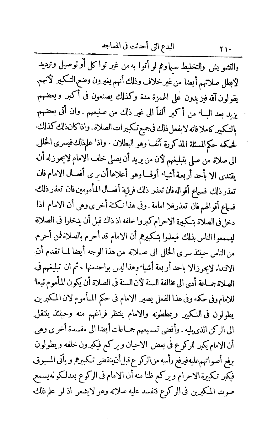 وَالتَّشْوِيشُ وَالتَّخْلِيطُ سِيَّمَا، وَهُمْ لَوْ أَتَوْا بِهِ مِنْ غَيْرِ تَوَاكُلٍ أَوْ تَوْصِيلٍ وَتَرْدِيدٍ لَأَبْطَلَ صَلَاتَهُمْ أَيْضًا مِنْ غَيْرِ خِلَافٍ، وَذَلِكَ أَنَّهُمْ يُغَيِّرُونَ وَضْعَ التَّكْبِيرِ؛ لِأَنَّهُمْ يَقُولُونَ: اللَّهُ فَيَزِيدُونَ عَلَى الْهَمْزَةِ مَدَّةً، وَكَذَلِكَ يَصْنَعُونَ فِي أَكْبَرُ، وَبَعْضُهُمْ يَزِيدُ بَعْدَ الْبَاءِ مِنْ أَكْبَرُ أَلِفًا إلَى غَيْرِ ذَلِكَ صَنِيعُهُمْ. وَإِنْ أَتَى بَعْضُهُمْ بِالتَّكْبِيرِ كَامِلًا فَإِنَّهُ لَا يَفْعَلُ ذَلِكَ فِي جَمِيعِ تَكْبِيرَاتِ الصَّلَاةِ. وَإِذَا كَانَ ذَلِكَ كَذَلِكَ فَحُكْمُهُ حُكْمُ الْمَسْأَلَةِ الْمَذْكُورَةِ آنِفًا وَهُوَ الْبُطْلَانُ. وَإِذَا عُلِمَ ذَلِكَ فَيَسْرِي الْخَلَلُ إلَى صَلَاةِ مَنْ صَلَّى بِتَبْلِيغِهِمْ؛ لِأَنَّ مَنْ يُرِيدُ أَنْ يُصَلِّيَ خَلْفَ الْإِمَامِ لَا يَجُوزُ لَهُ أَنْ يَقْتَدِيَ إلَّا بِأَحَدِ أَرْبَعَةِ أَشْيَاءَ. أَوَّلُهَا وَهُوَ أَعْلَاهَا: أَنْ يَرَى أَفْعَالَ الْإِمَامِ، فَإِنْ تَعَذَّرَ ذَلِكَ فَسَمَاعُ أَقْوَالِهِ، فَإِنْ تَعَذَّرَ ذَلِكَ فَرُؤْيَةُ أَفْعَالِ الْمَأْمُومِينَ، فَإِنْ تَعَذَّرَ ذَلِكَ فَسَمَاعُ أَقْوَالِهِمْ، فَإِنْ تَعَذَّرَ فَلَا إمَامَةَ.