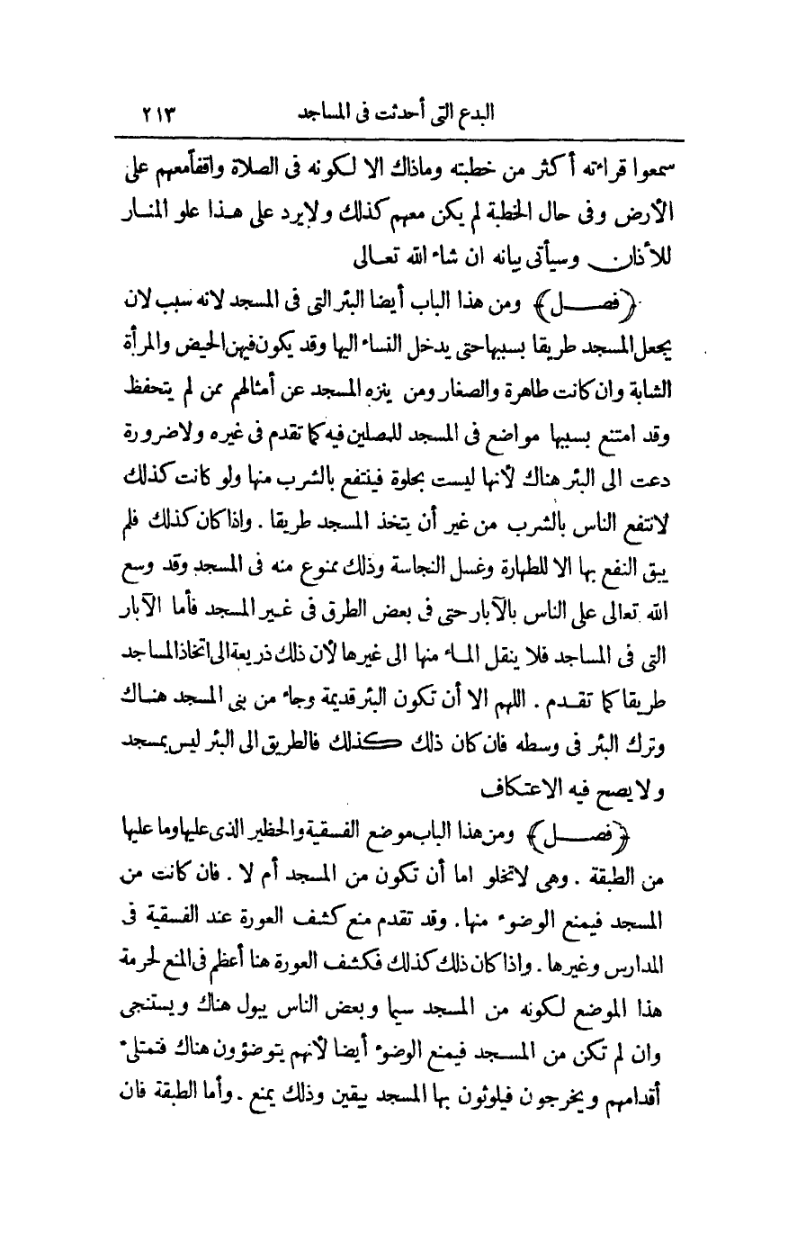 (فَصْلٌ) وَمِنْ هَذَا الْبَابِ مَوْضِعُ الْفَسْقِيَّةِ وَالْحَظِيرِ الَّذِي عَلَيْهَا وَمَا عَلَيْهَا مِنْ الطَّبَقَةِ. وَهِيَ لَا تَخْلُو إمَّا أَنْ تَكُونَ مِنْ الْمَسْجِدِ أَمْ لَا. فَإِنْ كَانَتْ مِنْ الْمَسْجِدِ فَيُمْنَعُ الْوُضُوءُ مِنْهَا. وَقَدْ مُنِعَ كَشْفُ الْعَوْرَةِ عِنْدَ الْفَسْقِيَّةِ فِي الْمَدَارِسِ وَغَيْرِهَا. وَإِذَا كَانَ ذَلِكَ كَذَلِكَ فَكَشْفُ الْعَوْرَةِ هُنَا أَعْظَمُ فِي الْمَنْعِ؛ لِحُرْمَةِ هَذَا الْمَوْضِعِ لِكَوْنِهِ مِنْ الْمَسْجِدِ سِيَّمَا وَبَعْضُ النَّاسِ يَبُولُ هُنَاكَ وَيَسْتَنْجِي، وَإِنْ لَمْ تَكُنْ مِنْ الْمَسْجِدِ فَيُمْنَعُ الْوُضُوءُ أَيْضًا؛ لِأَنَّهُمْ يَتَوَضَّئُونَ هُنَاكَ فَتَمْتَلِئُ أَقْدَامُهُمْ وَيَخْرُجُونَ فَيُلَوِّثُونَ بِهَا الْمَسْجِدَ بِيَقِينٍ وَذَلِكَ يُمْنَعُ.