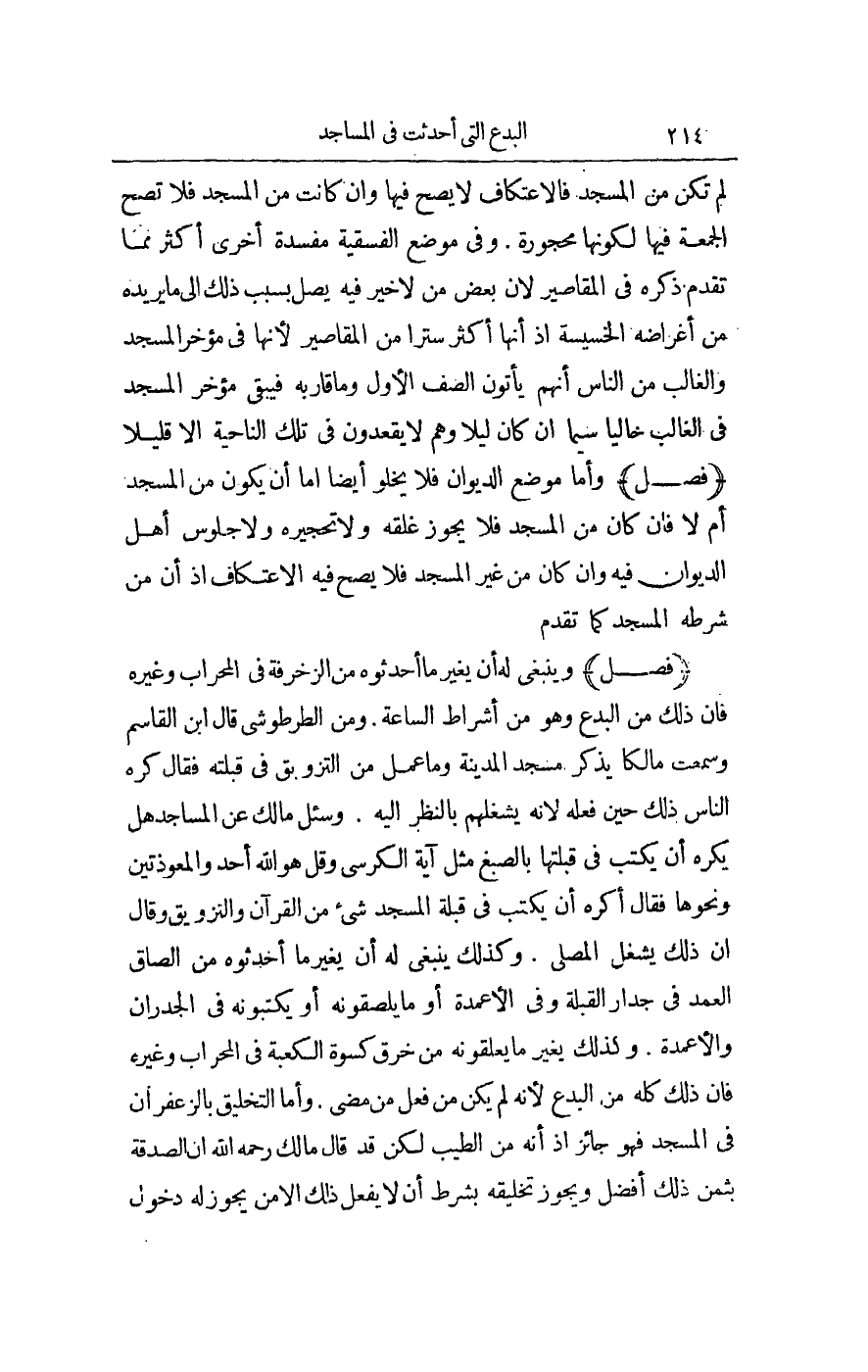 وَمِنْ الطُّرْطُوشِيِّ قَالَ ابْنُ الْقَاسِمِ: وَسَمِعْتُ مَالِكًا يَذْكُرُ مَسْجِدَ الْمَدِينَةِ وَمَا عُمِلَ مِنْ التَّزْوِيقِ فِي قِبْلَتِهِ فَقَالَ: كَرِهَ النَّاسُ ذَلِكَ حِينَ فَعَلَهُ؛ لِأَنَّهُ يَشْغَلُهُمْ بِالنَّظَرِ إلَيْهِ. وَسُئِلَ مَالِكٌ عَنْ الْمَسَاجِدِ هَلْ يُكْرَهُ أَنْ يُكْتَبَ فِي قِبْلَتِهَا بِالصَّبْغِ مِثْلَ آيَةِ الْكُرْسِيِّ وَقُلْ هُوَ اللَّهُ أَحَدٌ وَالْمُعَوِّذَتَيْنِ وَنَحْوِهَا فَقَالَ: أَكْرَهُ أَنْ يُكْتَبَ فِي قِبْلَةِ الْمَسْجِدِ شَيْءٌ مِنْ الْقُرْآنِ وَالتَّزْوِيقِ وَقَالَ: إنَّ ذَلِكَ يَشْغَلُ الْمُصَلِّيَ. وَكَذَلِكَ يَنْبَغِي لَهُ أَنْ يُغَيِّرَ مَا أَحْدَثُوهُ مِنْ إلْصَاقِ الْعُمُدِ فِي جِدَارِ الْقِبْلَةِ وَفِي الْأَعْمِدَةِ، أَوْ مَا يُلْصِقُونَهُ أَوْ يَكْتُبُونَهُ فِي الْجُدْرَانِ وَالْأَعْمِدَةِ. وَكَذَلِكَ يُغَيِّرُ مَا يُعَلِّقُونَهُ مِنْ خِرَقِ كِسْوَةِ الْكَعْبَةِ فِي الْمِحْرَابِ وَغَيْرِهِ، فَإِنَّ ذَلِكَ كُلَّهُ مِنْ الْبِدَعِ؛ لِأَنَّهُ لَمْ يَكُنْ مِنْ فِعْلِ مَنْ مَضَى.