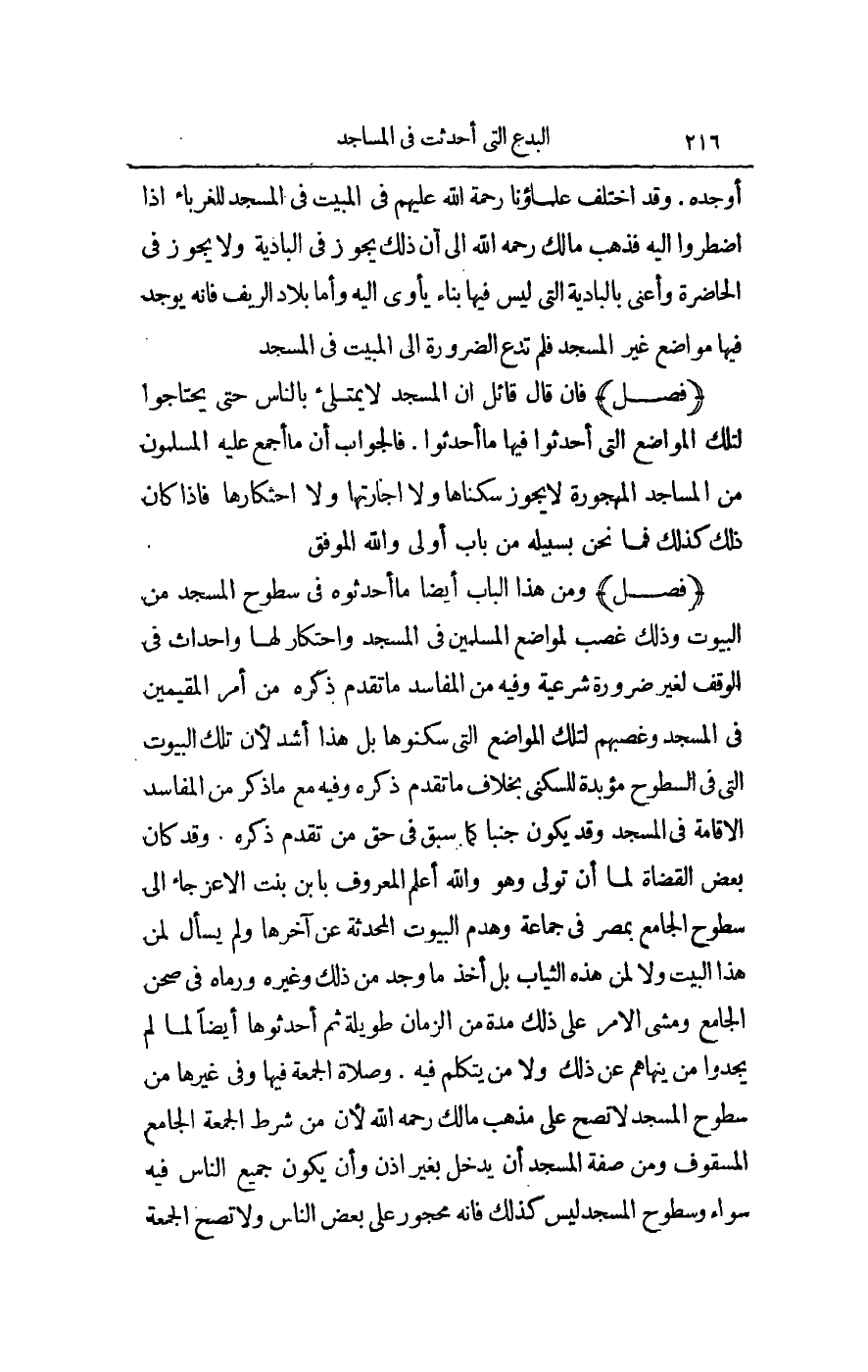 وَمِنْ هَذَا الْبَابِ أَيْضًا مِمَّا أَحْدَثُوهُ فِي سُطُوحِ الْمَسْجِدِ مِنْ الْبُيُوتِ، وَذَلِكَ غَصْبٌ لِمَوَاضِع الْمُسْلِمِينَ فِي الْمَسْجِدِ وَاحْتِكَارٌ لَهَا وَإِحْدَاثٌ فِي الْوَقْفِ لِغَيْرِ ضَرُورَةٍ شَرْعِيَّةٍ، وَفِيهِ مِنْ الْمَفَاسِدِ مَا تَقَدَّمَ ذِكْرُهُ مِنْ أَمْرِ الْمُقِيمِينَ فِي الْمَسْجِدِ وَغَصْبِهِمْ لِتِلْكَ الْمَوَاضِعِ الَّتِي سَكَنُوهَا، بَلْ هَذَا أَشَدُّ؛ لِأَنَّ تِلْكَ الْبُيُوتَ الَّتِي فِي السُّطُوحِ مُؤَبَّدَةً لِلسُّكْنَى، بِخِلَافِ مَا تَقَدَّمَ ذِكْرُهُ، وَفِيهِ مَعَ مَا ذُكِرَ مِنْ الْمَفَاسِدِ الْإِقَامَةُ فِي الْمَسْجِدِ، وَقَدْ يَكُونُ جُنُبًا كَمَا سَبَقَ فِي حَقِّ مَنْ تَقَدَّمَ ذِكْرُهُ.