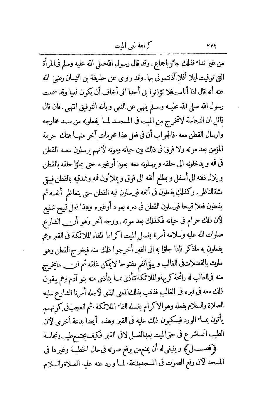 وَقَدْ «قَالَ رَسُولُ اللَّهِ - صَلَّى اللَّهُ عَلَيْهِ وَسَلَّمَ - فِي الْمَرْأَةِ الَّتِي تُوُفِّيَتْ لَيْلًا: أَفَلَا آذَنْتُمُونِي بِهَا» . وَقَدْ رُوِيَ عَنْ حُذَيْفَةَ بْنِ الْيَمَانِ - رَضِيَ اللَّهُ عَنْهُ - أَنَّهُ قَالَ: إذَا أَنَا مِتُّ فَلَا تُؤَذِّنُوا بِي أَحَدًا إنِّي أَخَافُ أَنْ يَكُونَ نَعْيًا، وَقَدْ «سَمِعْتُ رَسُولَ اللَّهِ - صَلَّى اللَّهُ عَلَيْهِ وَسَلَّمَ - يَنْهَى عَنْ النَّعْيِ» وَبِاَللَّهِ التَّوْفِيقُ انْتَهَى.
