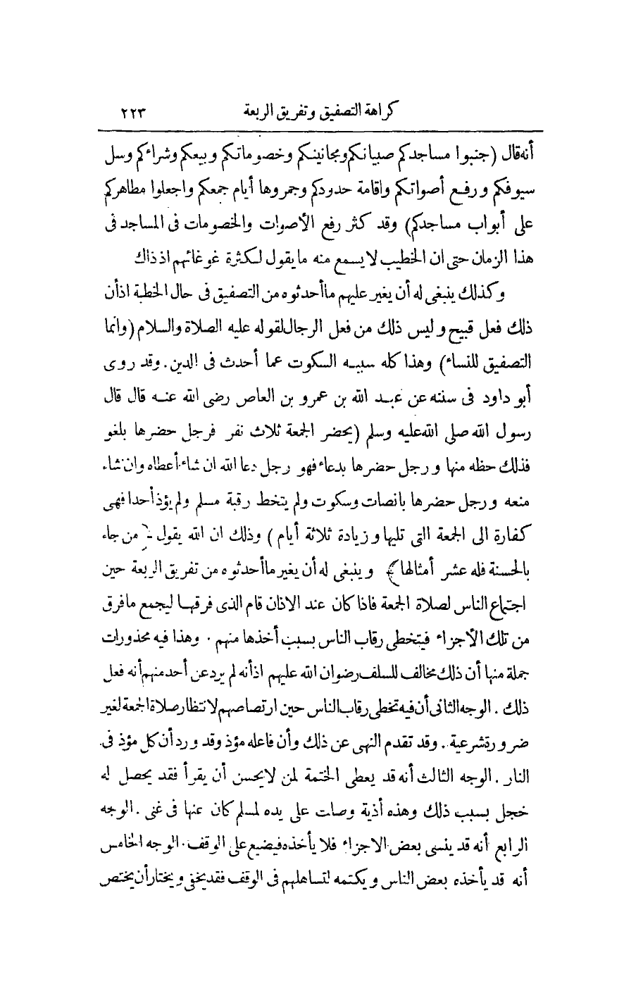 أَنَّهُ قَالَ: «جَنِّبُوا مَسَاجِدَكُمْ صِبْيَانَكُمْ وَمَجَانِينَكُمْ وَخُصُومَاتِكُمْ وَبَيْعَكُمْ وَشِرَاءَكُمْ وَسَلَّ سُيُوفِكُمْ وَرَفْعَ أَصْوَاتِكُمْ وَإِقَامَةَ حُدُودِكُمْ، وَجَمِّرُوهَا أَيَّامَ جُمَعِكُمْ وَاجْعَلُوا مَطَاهِرَكُمْ عَلَى أَبْوَابِ مَسَاجِدِكُمْ» وَقَدْ كَثُرَ رَفْعُ الْأَصْوَاتِ وَالْخُصُومَاتُ فِي الْمَسَاجِدِ فِي هَذَا الزَّمَانِ حَتَّى إنَّ الْخَطِيبَ لَا يُسْمَعُ مِنْهُ مَا يَقُولُ لِكَثْرَةِ غَوْغَائِهِمْ إذْ ذَاكَ.