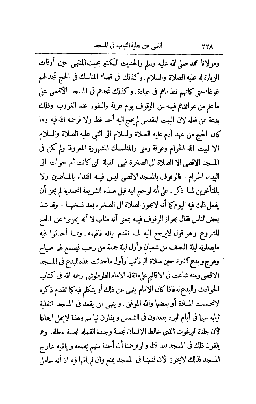 وَكَذَلِكَ فِي قَضَاءِ الْمَنَاسِكِ فِي الْحَجِّ تَجِدُ لَهُمْ غَوْغَاءَ حَتَّى كَأَنَّهُمْ قَطُّ مَا هُمْ فِي عِبَادَةٍ. وَكَذَلِكَ تَجِدُهُمْ فِي الْمَسْجِدِ الْأَقْصَى عَلَى مَا عُلِمَ مِنْ عَوَائِدِهِمْ فِيهِ مِنْ الْوُقُوفِ يَوْمَ عَرَفَةَ وَالنُّفُورِ عِنْدَ الْغُرُوبِ، وَذَلِكَ بِدْعَةٌ مِمَّنْ فَعَلَهُ؛ لِأَنَّ الْبَيْتَ الْمُقَدَّسَ لَمْ يَحُجَّ إلَيْهِ أَحَدٌ قَطُّ وَلَا فَرَضَهُ اللَّهُ فِيهِ وَمَا كَانَ الْحَجُّ مِنْ عَهْدِ آدَمَ - عَلَيْهِ الصَّلَاةُ وَالسَّلَامُ - إلَى النَّبِيِّ - عَلَيْهِ الصَّلَاةُ وَالسَّلَامُ - إلَّا لِبَيْتِ اللَّهِ الْحَرَامِ وَعَرَفَةَ وَمِنًى وَالْمَنَاسِكِ الْمَشْهُورَةِ الْمَعْرُوفَةِ، وَلَمْ يَكُنْ فِي الْمَسْجِدِ الْأَقْصَى إلَّا الصَّلَاةُ إلَى الصَّخْرَةِ، فَهِيَ الْقِبْلَةُ الَّتِي كَانَتْ ثُمَّ حُوِّلَتْ إلَى الْبَيْتِ الْحَرَامِ. فَالْوُقُوفُ بِالْمَسْجِدِ الْأَقْصَى لَيْسَ فِيهِ اقْتِدَاءٌ بِالْمَاضِينَ وَلَا بِالْمُتَأَخِّرِينَ لِمَا ذُكِرَ. عَلَى أَنَّهُ لَوْ حَجَّ إلَيْهِ قَبْلَ هَذِهِ الشَّرِيعَةِ الْمُحَمَّدِيَّةِ لَمْ يَجُزْ أَنْ يَفْعَلَ ذَلِكَ فِيهِ الْيَوْمَ، كَمَا أَنَّهُ لَا تَجُوزُ الصَّلَاةُ إلَى الصَّخْرَةِ بَعْدَ نَسْخِهَا.