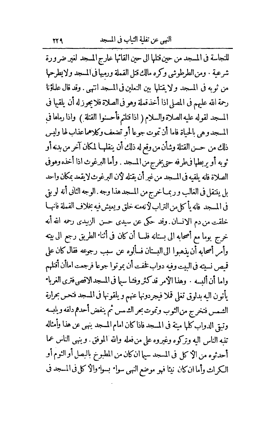 الْوَجْهُ الثَّانِي: أَنَّهُ لَوْ بَقِيَ فِي الْمَسْجِدِ فَإِنَّهُ يَأْكُلُ مِنْ التُّرَابِ؛ لِأَنَّهُ مِنْهُ خُلِقَ وَيَعِيشُ فِيهِ بِخِلَافِ الْقَمْلَةِ، فَإِنَّهَا خُلِقَتْ مِنْ دَمِ الْإِنْسَانِ. وَقَدْ حُكِيَ عَنْ سَيِّدِي حَسَنٍ الزُّبَيْدِيِّ - رَحِمَهُ اللَّهُ - أَنَّهُ خَرَجَ يَوْمًا مَعَ أَصْحَابِهِ إلَى بُسْتَانِهِ، فَلَمَّا أَنْ كَانَ فِي أَثْنَاءِ الطَّرِيقِ رَجَعَ إلَى بَيْتِهِ وَأَمَرَ أَصْحَابَهُ أَنْ يَذْهَبُوا إلَى الْبُسْتَانِ فَسَأَلُوهُ عَنْ سَبَبِ رُجُوعِهِ فَقَالَ: كَانَ عَلَيَّ قَمِيصٌ نَسِيتُهُ فِي الْبَيْتِ وَفِيهِ دَوَابُّ فَخِفْتُ أَنْ يَمُوتُوا جُوعًا فَرَجَعْتُ إمَّا أَنْ أَقْتُلَهُمْ وَإِمَّا أَنْ أَلْبَسَهُ. وَهَذَا الْأَمْرُ قَدْ كَثُرَ وَفَشَا سِيَّمَا فِي الْمَسْجِدِ الْأَقْصَى فَتَرَى الْغُرَبَاءَ يَأْتُونَ إلَيْهِ بِدُلُوقٍ تَغْلِي قَمْلًا فَيُجَرِّدُونَهَا عَنْهُمْ وَيُلْقُونَهَا فِي الْمَسْجِدِ، فَتَحُسُّ بِحَرَارَةِ الشَّمْسِ فَتَخْرُجُ مِنْ الثَّوْبِ وَتَمُوتُ بِحَرِّ الشَّمْسِ، ثُمَّ يَنْفُضُ أَحَدُهُمْ دَلْقَهُ وَيَلْبَسُهُ وَتَبْقَى الدَّوَابُّ كُلُّهَا مَيِّتَةً فِي الْمَسْجِدِ، فَإِذَا كَانَ إمَامُ الْمَسْجِدِ يَنْهَى عَنْ هَذَا وَأَمْثَالِهِ تَنَبَّهَ النَّاسُ إلَيْهِ وَتَرَكُوهُ وَغَيَّرُوهُ عَلَى مَنْ فَعَلَهُ، وَاَللَّهُ الْمُوَفِّقُ.