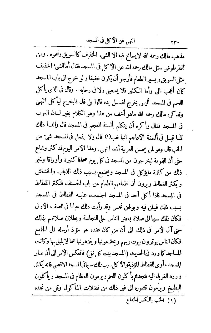 مَذْهَبِ مَالِكٍ - رَحِمَهُ اللَّهُ - لَا يُسَامَحُ فِيهِ إلَّا الشَّيْءَ الْخَفِيفَ كَالسَّوِيقِ وَنَحْوِهِ. وَمِنْ الطُّرْطُوشِيِّ سُئِلَ مَالِكٌ - رَحِمَهُ اللَّهُ - عَنْ الْأَكْلِ فِي الْمَسْجِدِ فَقَالَ: أَمَّا الشَّيْءُ الْخَفِيفُ مِثْلَ السَّوِيقِ وَيَسِيرِ الطَّعَامِ فَأَرْجُو أَنْ يَكُونَ خَفِيفًا، وَلَوْ خَرَجَ إلَى بَابِ الْمَسْجِدِ كَانَ أَعْجَبَ إلَيَّ وَأَمَّا الْكَثِيرُ فَلَا يُعْجِبُنِي وَلَا فِي رِحَابِهِ. وَقَالَ فِي الَّذِي يَأْكُلُ اللَّحْمَ فِي الْمَسْجِدِ: أَلَيْسَ يَخْرُجُ لِغَسْلِ يَدِهِ؟ قَالُوا: بَلَى قَالَ: فَلْيَخْرُجْ لِيَأْكُلْ انْتَهَى، وَقَدْ كَرِهَ مَالِكٌ - رَحِمَهُ اللَّهُ - مَا هُوَ أَخَفُّ مِنْ هَذَا وَهُوَ الْكَلَامُ بِغَيْرِ لِسَانِ الْعَرَبِ فِي الْمَسْجِدِ فَقَالَ: وَأَكْرَهُ أَنْ يَتَكَلَّمَ بِأَلْسِنَةِ الْعَجَمِ فِي الْمَسْجِدِ قَالَ: وَإِنَّمَا ذَلِكَ لِمَا قِيلَ فِي أَلْسِنَةِ الْأَعَاجِمِ إنَّهَا خَبٌّ قَالَ: وَلَا يُفْعَلُ فِي الْمَسْجِدِ شَيْءٌ مِنْ الْخَبِّ قَالَ: وَهُوَ لِمَنْ يُحْسِنُ الْعَرَبِيَّةَ أَشَدُّ انْتَهَى.