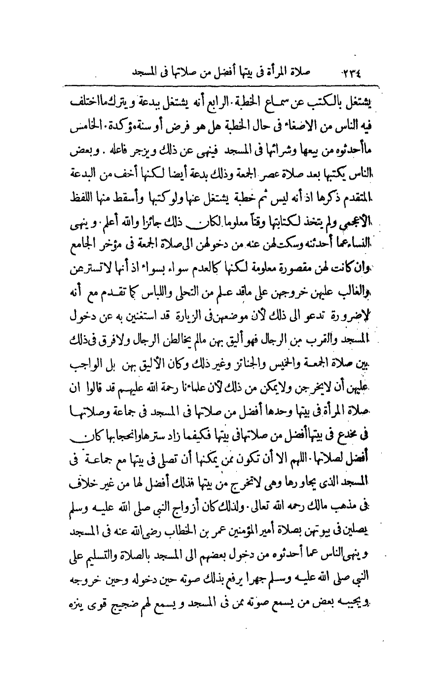 وَلِذَلِكَ كَانَ أَزْوَاجُ النَّبِيِّ - صَلَّى اللَّهُ عَلَيْهِ وَسَلَّمَ - يُصَلِّينَ فِي بُيُوتِهِنَّ بِصَلَاةِ أَمِيرِ الْمُؤْمِنِينَ عُمَرَ بْنِ الْخَطَّابِ - رَضِيَ اللَّهُ عَنْهُ - فِي الْمَسْجِدِ