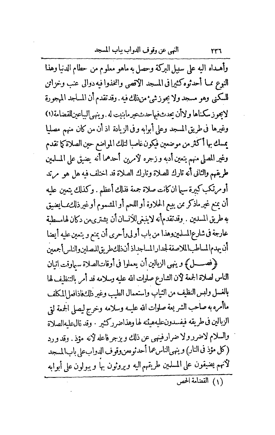 وَأَهْدَاهُ إلَيْهِ عَلَى سَبِيلِ الْبَرَكَةِ وَحَصَّلَ بِهِ مَا هُوَ مَعْلُومٌ مِنْ حُطَامِ الدُّنْيَا وَهَذَا النَّوْعُ مِمَّا أَحْدَثُوهُ كَثِيرًا فِي الْمَسْجِدِ الْأَقْصَى وَاِتَّخَذُوا فِيهِ دَوَالِيَ عِنَبٍ وَخَزَائِنَ لِلسُّكْنَى وَهُوَ مَسْجِدٌ وَلَا يَجُوزُ شَيْءٌ مِنْ ذَلِكَ فِيهِ. وَقَدْ تَقَدَّمَ أَنَّ الْمَسَاجِدَ الْمَهْجُورَةَ لَا يَجُوزُ سُكْنَاهَا وَلَا أَنْ يُحْدَثَ فِيهَا حَدَثٌ غَيْرُ مَا بُنِيَتْ لَهُ.