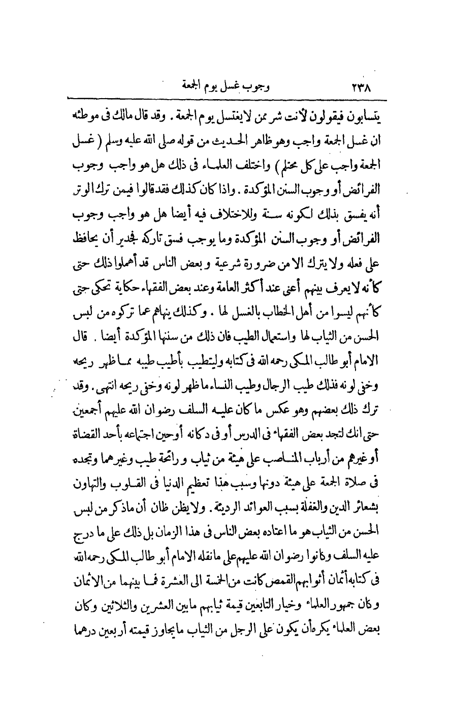وَقَدْ تَرَكَ ذَلِكَ بَعْضُهُمْ وَهُوَ عَكْسُ مَا كَانَ عَلَيْهِ السَّلَفُ - رِضْوَانُ اللَّهِ عَلَيْهِمْ أَجْمَعِينَ - حَتَّى إنَّكَ لَتَجِدُ بَعْضَ الْفُقَهَاءِ فِي الدَّرْسِ أَوْ فِي دُكَّانِهِ أَوْ حِينَ اجْتِمَاعِهِ بِأَحَدِ الْقُضَاةِ أَوْ غَيْرِهِمْ مِنْ أَرْبَابِ الْمَنَاصِبِ عَلَى هَيْئَةٍ مِنْ ثِيَابٍ وَرَائِحَةِ طِيبٍ وَغَيْرِهِمَا وَتَجِدُهُ فِي صَلَاةِ الْجُمُعَةِ عَلَى هَيْئَةٍ دُونَهَا وَسَبَبُ هَذَا تَعْظِيمُ الدُّنْيَا فِي الْقُلُوبِ وَالتَّهَاوُنُ بِشَعَائِر الدِّينِ وَالْغَفْلَةُ بِسَبَبِ الْعَوَائِدِ الرَّدِيئَةِ. وَلَا يَظُنُّ ظَانٌّ أَنَّ مَا ذُكِرَ مِنْ لُبْسِ الْحَسَنِ مِنْ الثِّيَابِ هُوَ مَا اعْتَادَهُ بَعْضُ النَّاسِ فِي هَذَا الزَّمَانِ بَلْ ذَلِكَ عَلَى مَا دَرَجَ عَلَيْهِ السَّلَفُ وَكَانُوا - رِضْوَانُ اللَّهِ عَلَيْهِمْ - عَلَى مَا نَقَلَهُ الْإِمَامُ أَبُو طَالِبٍ الْمَكِّيُّ - رَحِمَهُ اللَّهُ - فِي كِتَابِهِ أَثْمَانُ أَثْوَابِهِمْ الْقُمُصُ كَانَتْ مِنْ الْخَمْسَةِ إلَى الْعَشَرَةِ فَمَا بَيْنَهُمَا مِنْ الْأَثْمَانِ وَكَانَ جُمْهُورُ الْعُلَمَاءِ وَخِيَارُ التَّابِعِينَ قِيمَةُ ثِيَابِهِمْ مَا بَيْنَ الْعِشْرِينَ وَالثَّلَاثِينَ وَكَانَ بَعْضُ الْعُلَمَاءِ يَكْرَهُ أَنْ يَكُونَ عَلَى الرَّجُلِ مِنْ الثِّيَابِ مَا يُجَاوِزُ قِيمَتُهُ أَرْبَعِينَ دِرْهَمًا