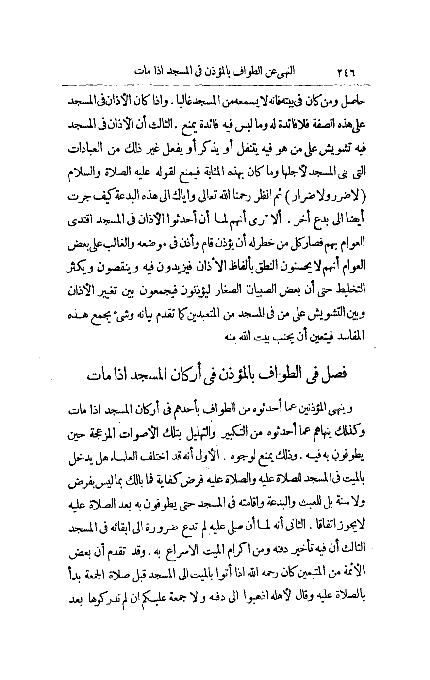 . فَصْلٌ فِي الطَّوَافِ بِالْمُؤَذِّنِ فِي أَرْكَانِ الْمَسْجِدِ إذَا مَاتَ وَيَنْهَى الْمُؤَذِّنِينَ عَمَّا أَحْدَثُوهُ مِنْ الطَّوَافِ بِأَحَدِهِمْ فِي أَرْكَانِ الْمَسْجِدِ إذَا مَاتَ وَكَذَلِكَ يَنْهَاهُمْ عَمَّا أَحْدَثُوهُ مِنْ التَّكْبِيرِ وَالتَّهْلِيلِ بِتِلْكَ الْأَصْوَاتِ الْمُزْعِجَةِ حِينَ يَطُوفُونَ بِهِ فِيهِ. وَذَلِكَ يُمْنَعُ لِوُجُوهٍ: