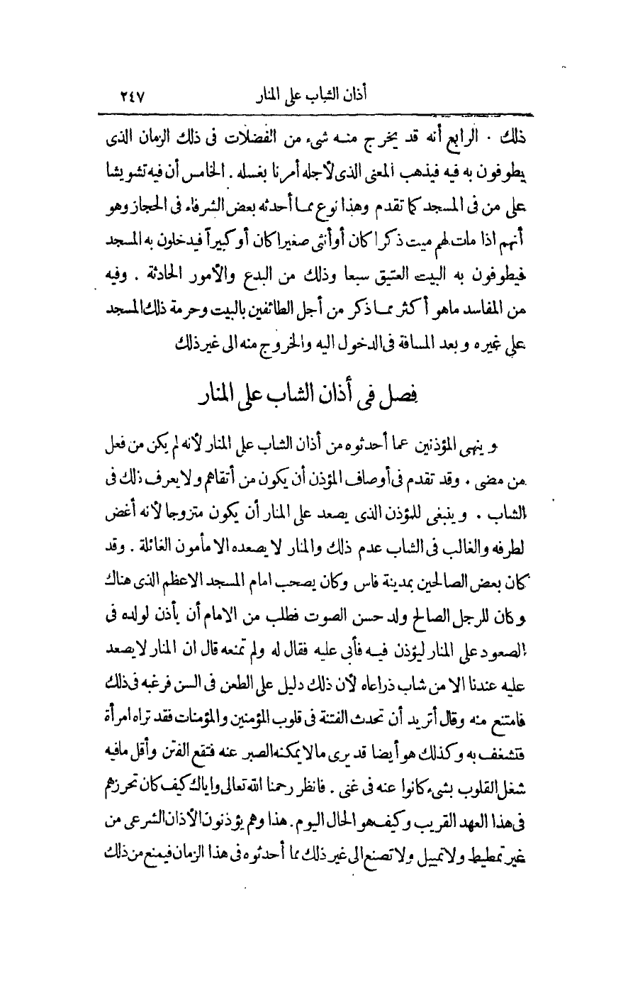 ِ وَيَنْهَى الْمُؤَذِّنِينَ عَمَّا أَحْدَثُوهُ مِنْ أَذَانِ الشَّابِّ عَلَى الْمَنَارِ لِأَنَّهُ لَمْ يَكُنْ مِنْ فِعْلِ مَنْ مَضَى.