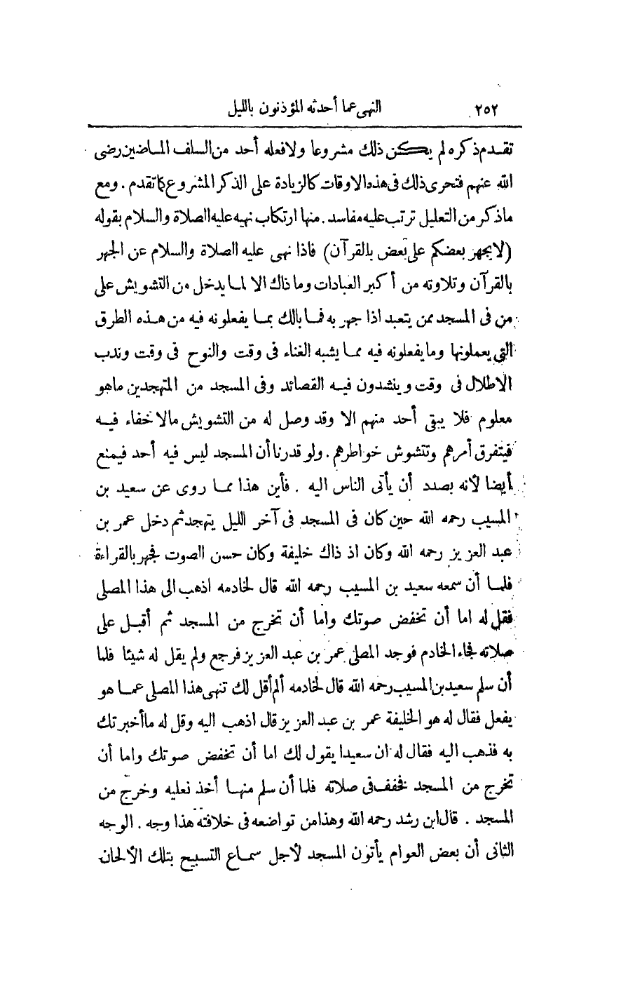 مِنْهَا ارْتِكَابُ نَهْيِهِ - عَلَيْهِ الصَّلَاةُ وَالسَّلَامُ - بِقَوْلِهِ «لَا يَجْهَرْ بَعْضُكُمْ عَلَى بَعْضٍ بِالْقُرْآنِ» فَإِذَا نَهَى - عَلَيْهِ الصَّلَاةُ وَالسَّلَامُ - عَنْ الْجَهْرِ بِالْقُرْآنِ وَتِلَاوَتُهُ مِنْ أَكْبَرِ الْعِبَادَاتِ وَمَا ذَاكَ إلَّا لِمَا يَدْخُلُ مِنْ التَّشْوِيشِ عَلَى مَنْ فِي الْمَسْجِدِ مِمَّنْ يَتَعَبَّدُ إذَا جَهَرَ بِهِ فَمَا بَالُكَ بِمَا يَفْعَلُونَهُ فِيهِ مِنْ هَذِهِ الطُّرُقِ الَّتِي يَعْمَلُونَهَا وَمَا يَفْعَلُونَهُ فِيهِ مِمَّا يُشْبِهُ الْغِنَاءَ فِي وَقْتٍ وَالنَّوْحَ فِي وَقْتٍ وَنَدْبَ الْأَطْلَالِ فِي وَقْتٍ وَيَنْشُدُونَ فِيهِ الْقَصَائِدَ وَفِي الْمَسْجِدِ مِنْ الْمُتَهَجِّدِينَ مَا هُوَ مَعْلُومٌ فَلَا يَبْقَى أَحَدٌ مِنْهُمْ إلَّا وَقَدْ وَصَلَ لَهُ مِنْ التَّشْوِيشِ مَا لَا خَفَاءَ فِيهِ فَيَتَفَرَّقُ أَمْرُهُمْ وَتَتَشَوَّشُ خَوَاطِرُهُمْ. وَلَوْ قَدَّرْنَا أَنَّ الْمَسْجِدَ لَيْسَ فِيهِ أَحَدٌ فَيُمْنَعُ أَيْضًا لِأَنَّهُ بِصَدَدِ أَنْ يَأْتِيَ النَّاسُ إلَيْهِ. فَأَيْنَ هَذَا مِمَّا رُوِيَ عَنْ سَعِيدِ بْنِ الْمُسَيِّبِ - رَحِمَهُ اللَّهُ - حِينَ كَانَ فِي الْمَسْجِدِ فِي آخِرِ اللَّيْلِ يَتَهَجَّدُ ثُمَّ دَخَلَ عُمَرُ بْنُ عَبْدِ الْعَزِيزِ - رَحِمَهُ اللَّهُ - وَكَانَ إذْ ذَاكَ خَلِيفَةً وَكَانَ حَسَنَ الصَّوْتِ فَجَهَرَ بِالْقِرَاءَةِ فَلَمَّا أَنْ سَمِعَهُ سَعِيدُ بْنُ الْمُسَيِّبِ - رَحِمَهُ اللَّهُ - قَالَ لِخَادِمِهِ اذْهَبْ إلَى هَذَا الْمُصَلَّى فَقُلْ لَهُ إمَّا أَنْ تَخْفِضَ صَوْتَكَ وَإِمَّا أَنْ تَخْرُجَ مِنْ الْمَسْجِدِ ثُمَّ أَقْبَلَ عَلَى صَلَاتِهِ فَجَاءَ الْخَادِمُ فَوَجَدَ الْمُصَلِّيَ عُمَرَ بْنَ عَبْدِ الْعَزِيزِ فَرَجَعَ وَلَمْ يَقُلْ لَهُ شَيْئًا فَلَمَّا أَنْ سَلَّمَ سَعِيدُ بْنُ الْمُسَيِّبِ - رَحِمَهُ اللَّهُ - قَالَ لِخَادِمِهِ أَلَمْ أَقُلْ لَكَ تَنْهَى هَذَا الْمُصَلَّى عَمَّا هُوَ يَفْعَلُ فَقَالَ لَهُ هُوَ الْخَلِيفَةُ عُمَرُ بْنُ عَبْدِ الْعَزِيزِ قَالَ اذْهَبْ إلَيْهِ وَقُلْ لَهُ مَا أَخْبَرْتُكَ بِهِ فَذَهَبَ إلَيْهِ فَقَالَ لَهُ: إنَّ سَعِيدًا يَقُولُ لَكَ إمَّا أَنْ تَخْفِضَ صَوْتَكَ وَإِمَّا أَنْ تَخْرُجَ مِنْ الْمَسْجِدِ فَخَفَّفَ فِي صَلَاتِهِ فَلَمَّا أَنْ سَلَّمَ مِنْهَا أَخَذَ نَعْلَيْهِ وَخَرَجَ مِنْ الْمَسْجِدِ.
