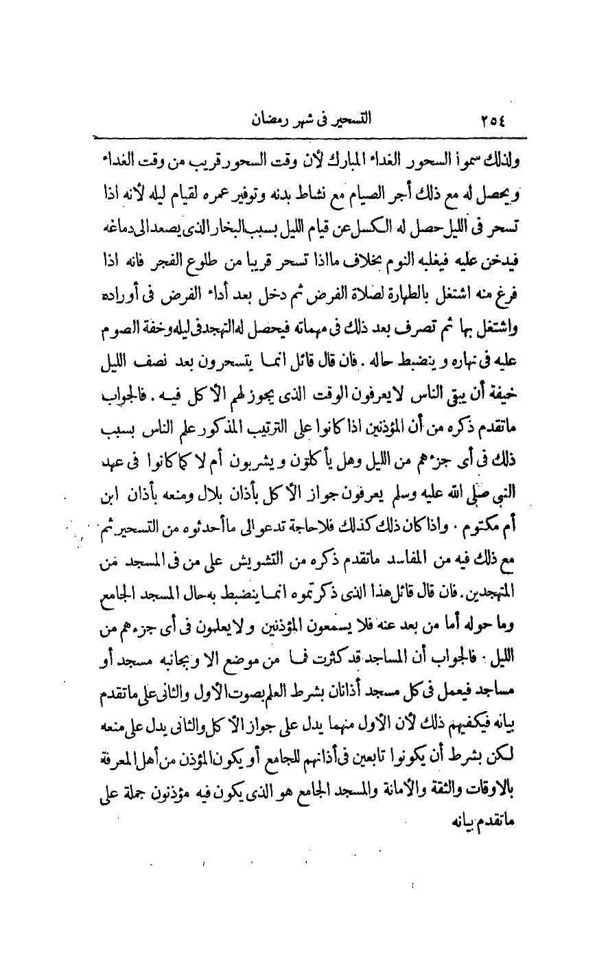 وَلِذَلِكَ سَمَّوْا السَّحُورَ الْغَدَاءَ الْمُبَارَكَ لِأَنَّ وَقْتَ السُّحُورِ قَرِيبٌ مِنْ وَقْتِ الْغَدَاءِ، وَيَحْصُلُ لَهُ مَعَ ذَلِكَ أَجْرُ الصِّيَامِ مَعَ نَشَاطِ بَدَنِهِ وَتَوْفِيرِ عُمْرِهِ لِقِيَامِ لَيْلِهِ لِأَنَّهُ إذَا تَسَحَّرَ فِي اللَّيْلِ حَصَلَ لَهُ الْكَسَلُ عَنْ قِيَامِ اللَّيْلِ بِسَبَبِ الْبُخَارِ الَّذِي يَصْعَدُ إلَى دِمَاغِهِ فَيُدَخِّنُ عَلَيْهِ فَيَغْلِبُهُ النَّوْمُ، بِخِلَافِ مَا إذَا تَسَحَّرَ قَرِيبًا مِنْ طُلُوعِ الْفَجْرِ فَإِنَّهُ إذَا فَرَغَ مِنْهُ اشْتَغَلَ بِالطَّهَارَةِ لِصَلَاةِ الْفَرْضِ ثُمَّ دَخَلَ بَعْدَ أَدَاءِ الْفَرْضِ فِي أَوْرَادِهِ وَاشْتَغَلَ بِهَا ثُمَّ تَصَرَّفَ بَعْدَ ذَلِكَ فِي مُهِمَّاتِهِ فَيَحْصُلُ لَهُ التَّهَجُّدُ فِي لَيْلِهِ وَخِفَّةُ الصَّوْمِ عَلَيْهِ فِي نَهَارِهِ وَيَنْضَبِطُ حَالُهُ. فَإِنْ قَالَ قَائِلٌ: إنَّمَا يَتَسَحَّرُونَ بَعْدَ نِصْفِ اللَّيْلِ خِيفَةَ أَنْ يَبْقَى النَّاسُ لَا يَعْرِفُونَ الْوَقْتَ الَّذِي يَجُوزُ لَهُمْ الْأَكْلُ فِيهِ. فَالْجَوَابُ مَا تَقَدَّمَ ذِكْرُهُ مِنْ أَنَّ الْمُؤَذِّنِينَ إذَا كَانُوا عَلَى التَّرْتِيبِ الْمَذْكُورِ عَلِمَ النَّاسُ بِسَبَبِ ذَلِكَ فِي أَيِّ جُزْئِهِمْ مِنْ اللَّيْلِ وَهَلْ يَأْكُلُونَ وَيَشْرَبُونَ أَمْ لَا؟ كَمَا كَانُوا فِي عَهْدِ النَّبِيِّ - صَلَّى اللَّهُ عَلَيْهِ وَسَلَّمَ - يَعْرِفُونَ جَوَازَ الْأَكْلِ بِأَذَانِ بِلَالٍ وَمَنْعَهُ بِأَذَانِ ابْنِ أُمِّ مَكْتُومٍ. وَإِذَا كَانَ ذَلِكَ كَذَلِكَ فَلَا حَاجَةَ تَدْعُو إلَى مَا أَحْدَثُوهُ مِنْ التَّسْحِيرِ، ثُمَّ مَعَ ذَلِكَ فِيهِ مِنْ الْمَفَاسِدِ مَا تَقَدَّمَ ذِكْرُهُ مِنْ التَّشْوِيشِ عَلَى مَنْ فِي الْمَسْجِدِ مِنْ الْمُتَهَجِّدِينَ. فَإِنْ قَالَ قَائِلٌ: هَذَا الَّذِي ذَكَرْتُمُوهُ إنَّمَا يَنْضَبِطُ بِهِ حَالُ الْمَسْجِدِ الْجَامِعِ وَمَا حَوْلَهُ أَمَّا مَنْ بَعُدَ عَنْهُ فَلَا يَسْمَعُونَ الْمُؤَذِّنِينَ وَلَا يَعْلَمُونَ فِي أَيِّ جُزْئِهِمْ مِنْ اللَّيْلِ. فَالْجَوَابُ أَنَّ الْمَسَاجِدَ قَدْ كَثُرَتْ فَمَا مِنْ مَوْضِعٍ إلَّا وَبِجَانِبِهِ مَسْجِدٌ أَوْ مَسَاجِدُ فَيُعْمَلُ فِي كُلِّ مَسْجِدٍ أَذَانَانِ بِشَرْطِ الْعِلْمِ بِصَوْتِ الْأَوَّلِ وَالثَّانِي عَلَى مَا تَقَدَّمَ بَيَانُهُ فَيَكْفِيهِمْ ذَلِكَ؛ لِأَنَّ الْأَوَّلَ مِنْهُمَا يَدُلُّ عَلَى جَوَازِ الْأَكْلِ وَالثَّانِي يَدُلَّ عَلَى مَنْعِهِ لَكِنْ بِشَرْطِ أَنْ يَكُونُوا تَابِعِينَ فِي أَذَانِهِمْ لِلْجَامِعِ أَوْ يَكُونَ الْمُؤَذِّنُ مِنْ أَهْلِ الْمَعْرِفَةِ بِالْأَوْقَاتِ وَالثِّقَةِ وَالْأَمَانَةِ، وَالْمَسْجِدُ الْجَامِعُ هُوَ الَّذِي يَكُونُ فِيهِ مُؤَذِّنُونَ جُمْلَةً عَلَى مَا تَقَدَّمَ بَيَانُهُ.