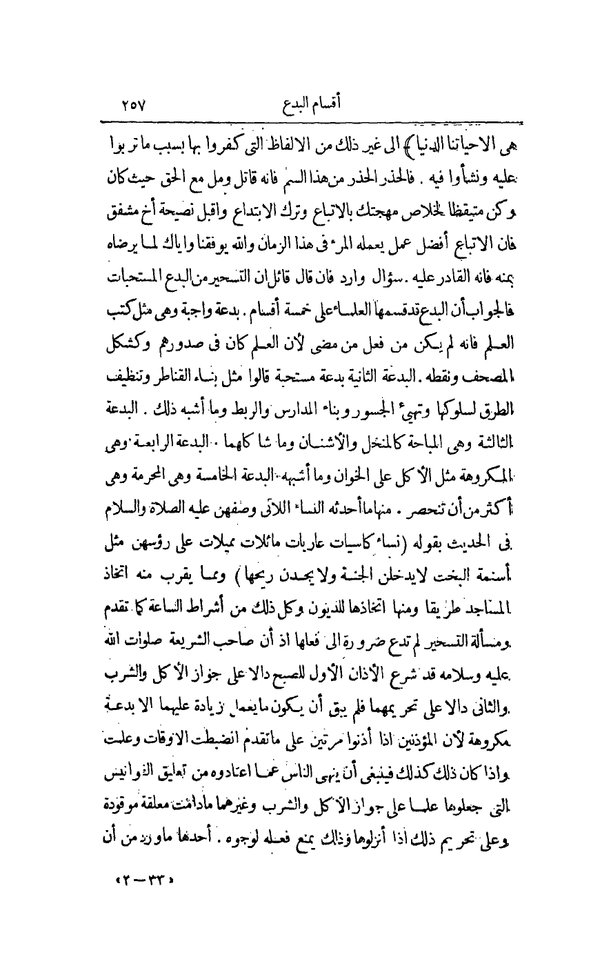 الْبِدْعَةُ الْخَامِسَةُ: وَهِيَ الْمُحَرَّمَةُ وَهِيَ أَكْثَرُ مِنْ أَنْ تَنْحَصِرَ. مِنْهَا مَا أَحْدَثَهُ النِّسَاءُ اللَّاتِي وَصَفَهُنَّ - عَلَيْهِ الصَّلَاةُ وَالسَّلَامُ - فِي الْحَدِيثِ بِقَوْلِهِ «نِسَاءٌ كَاسِيَاتٌ عَارِيَّاتٌ مَائِلَاتٌ مُمِيلَاتٌ عَلَى رُءُوسِهِنَّ مِثْلُ أَسْنِمَةِ الْبُخْتِ لَا يَدْخُلْنَ الْجَنَّةَ وَلَا يَجِدْنَ رِيحَهَا» وَمِمَّا يَقْرَبُ مِنْهُ اتِّخَاذُ الْمَسَاجِدِ طَرِيقًا وَمِنْهَا اتِّخَاذُهَا لِلدُّيُونِ وَكُلّ ذَلِكَ مِنْ أَشْرَاطِ السَّاعَةِ كَمَا تَقَدَّمَ، وَمَسْأَلَةُ التَّسْحِيرِ لَمْ تَدْعُ ضَرُورَةٌ إلَى فِعْلِهَا إذْ إنَّ صَاحِبَ الشَّرِيعَةِ صَلَوَاتُ اللَّهِ عَلَيْهِ وَسَلَامُهُ قَدْ شَرَعَ الْأَذَانَ الْأَوَّلَ لِلصُّبْحِ دَالًّا عَلَى جَوَازِ الْأَكْلِ وَالشُّرْبِ وَالثَّانِي دَالًا عَلَى تَحْرِيمِهِمَا فَلَمْ يَبْقَ أَنْ يَكُونَ مَا يُعْمَلُ زِيَادَةً عَلَيْهِمَا إلَّا بِدْعَةٌ مَكْرُوهَةٌ لِأَنَّ الْمُؤَذِّنِينَ إذَا أَذَّنُوا مَرَّتَيْنِ عَلَى مَا تَقَدَّمَ انْضَبَطَتْ الْأَوْقَاتُ وَعُلِمَتْ، وَإِذَا كَانَ ذَلِكَ كَذَلِكَ فَيَنْبَغِي أَنْ يُنْهَى النَّاسُ عَمَّا اعْتَادُوهُ مِنْ تَعْلِيقِ الْفَوَانِيسِ الَّتِي جَعَلُوهَا عَلَمًا عَلَى جَوَازِ الْأَكْلِ وَالشُّرْبِ وَغَيْرِهِمَا مَا دَامَتْ مُعَلَّقَةً مَوْقُودَةً وَعَلَى تَحْرِيمِ ذَلِكَ إذَا أَنْزَلُوهَا، وَذَلِكَ يُمْنَعُ فِعْلُهُ لِوُجُوهٍ: أَحَدُهَا مَا وَرَدَ مِنْ أَنَّ