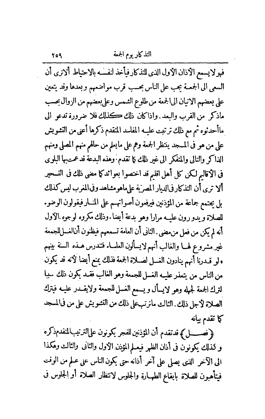 فَهُوَ لَا يَسْمَعُ الْأَذَانَ الْأَوَّلَ الَّذِي لِلتَّذْكَارِ فَيَأْخُذُ لِنَفْسِهِ بِالِاحْتِيَاطِ، أَلَّا تَرَى أَنَّ السَّعْيَ إلَى الْجُمُعَةِ يَجِبُ عَلَى النَّاسِ بِحَسَبِ قُرْبِ مَوَاضِعِهِمْ وَبُعْدِهَا، وَقَدْ يَتَعَيَّنُ عَلَى بَعْضِهِمْ الْإِتْيَانُ إلَى الْجُمُعَةِ مِنْ طُلُوعِ الشَّمْسِ، وَعَلَى بَعْضِهِمْ مِنْ الزَّوَالِ بِحَسَبِ مَا ذُكِرَ مِنْ الْقُرْبِ وَالْبُعْدِ. وَإِذَا كَانَ ذَلِكَ كَذَلِكَ فَلَا ضَرُورَةَ تَدْعُو إلَى مَا أَحْدَثُوهُ ثُمَّ مَعَ ذَلِكَ تَرَتَّبَتْ عَلَيْهِ الْمَفَاسِدُ الْمُتَقَدِّمُ ذِكْرُهَا أَعْنِي مِنْ التَّشْوِيشِ عَلَى مَنْ هُوَ فِي الْمَسْجِدِ يَنْتَظِرُ الْجُمُعَةَ، وَهُمْ عَلَى مَا يُعْلَمُ مِنْ حَالِهِمْ مِنْهُمْ الْمُصَلِّي وَمِنْهُمْ الذَّاكِرُ وَالتَّالِي وَالْمُتَفَكِّرُ إلَى غَيْرِ ذَلِكَ كَمَا تَقَدَّمَ. وَهَذِهِ الْبِدْعَةُ قَدْ عَمَّتْ بِهَا الْبَلْوَى فِي الْأَقَالِيمِ لَكِنَّ كُلَّ أَهْلِ إقْلِيمٍ قَدْ اخْتَصُّوا بِعَوَائِدَ كَمَا مَضَى ذَلِكَ فِي التَّسْحِيرِ، أَلَا تَرَى أَنَّ التَّذْكَارَ فِي الدِّيَارِ الْمِصْرِيَّةِ عَلَى مَا هُوَ مُشَاهَدٌ وَفِي الْمَغْرِبِ لَيْسَ كَذَلِكَ بَلْ يَجْتَمِعُ جَمَاعَةٌ مِنْ الْمُؤَذِّنِينَ فَيَرْفَعُونَ أَصْوَاتَهُمْ عَلَى الْمَنَارِ فَيَقُولُونَ الْوُضُوءَ لِلصَّلَاةِ وَيَدُورُونَ عَلَيْهِ مِرَارًا وَهُوَ بِدْعَةٌ أَيْضًا.