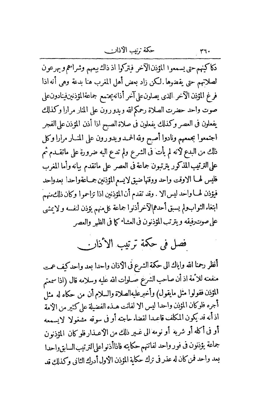 اُنْظُرْ رَحِمَنَا اللَّهُ وَإِيَّاكَ إلَى حِكْمَةِ الشَّرْعِ فِي الْأَذَانِ وَاحِدًا بَعْدَ وَاحِدٍ كَيْفَ عَمَّتْ مَنْفَعَتُهُ لِلْأُمَّةِ إذْ إنَّ صَاحِبَ الشَّرْعِ صَلَوَاتُ اللَّهِ عَلَيْهِ وَسَلَامُهُ قَالَ «إذَا سَمِعْتُمْ الْمُؤَذِّنَ فَقُولُوا مِثْلَ مَا يَقُولُ» وَأَخْبَرَ - عَلَيْهِ الصَّلَاةُ وَالسَّلَامُ - أَنَّ مَنْ حَكَاهُ لَهُ مِثْلُ أَجْرِهِ فَلَوْ كَانَ الْمُؤَذِّنُ وَاحِدًا لَيْسَ إلَّا لَفَاتَتْ هَذِهِ الْفَضِيلَةُ عَلَى كَثِيرٍ مِنْ الْأُمَّةِ إذْ إنَّهُ قَدْ يَكُونُ الْمُكَلَّفُ قَاعِدًا لِقَضَاءِ حَاجَتِهِ أَوْ فِي سُوقِهِ مَشْغُولًا لَا يَسْمَعُهُ أَوْ فِي أَكْلِهِ أَوْ شُرْبِهِ أَوْ نَوْمِهِ إلَى غَيْرِ ذَلِكَ مِنْ الْأَعْذَارِ، فَلَوْ كَانَ الْمُؤَذِّنُونَ جَمَاعَةً يُؤَذِّنُونَ فِي فَوْرٍ وَاحِدٍ لَفَاتَتْهُمْ حِكَايَتُهُ، فَإِذَا أَذَّنُوا عَلَى التَّرْتِيبِ السَّابِقِ وَاحِدًا بَعْدَ وَاحِدٍ فَمَنْ كَانَ لَهُ عُذْرٌ فِي تَرْكِ حِكَايَةِ الْمُؤَذِّنِ الْأَوَّلِ أَدْرَكَ الثَّانِي، وَكَذَلِكَ قَدْ