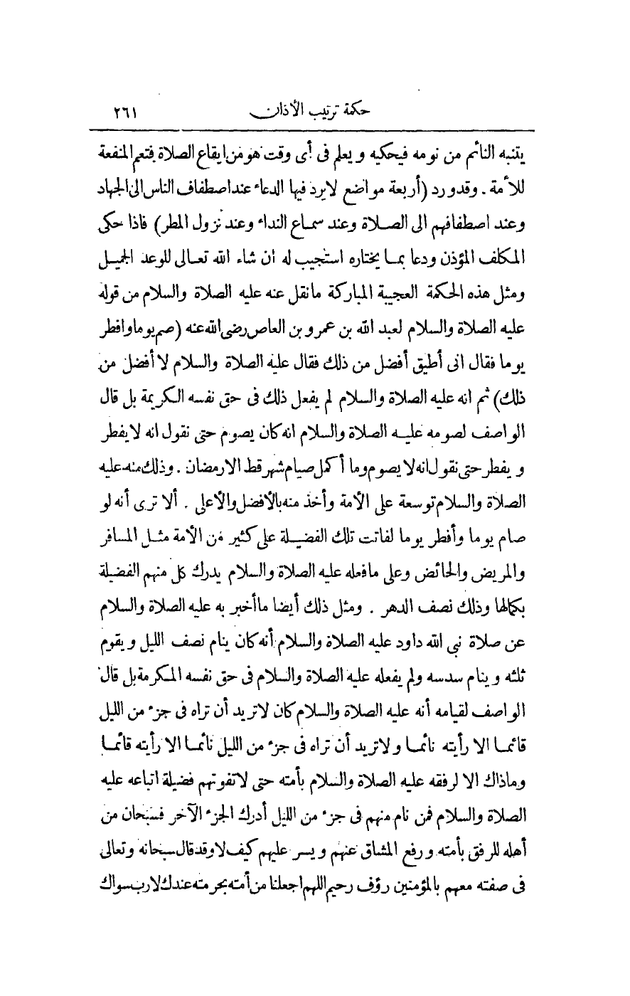 وَقَدْ وَرَدَ «أَرْبَعَةُ مَوَاضِعَ لَا يُرَدُّ فِيهَا الدُّعَاءُ عِنْدَ اصْطِفَافِ النَّاسِ إلَى الْجِهَادِ وَعِنْدَ اصْطِفَافِهِمْ إلَى الصَّلَاةِ وَعِنْدَ سَمَاعِ النِّدَاءِ وَعِنْدَ نُزُولِ الْمَطَرِ» فَإِذَا حَكَى الْمُكَلَّفُ الْمُؤَذِّنَ وَدَعَا بِمَا يَخْتَارُهُ اُسْتُجِيبَ لَهُ إنْ شَاءَ اللَّهُ تَعَالَى لِلْوَعْدِ الْجَمِيلِ، وَمِثْلُ هَذِهِ الْحِكْمَةِ الْعَجِيبَةِ الْمُبَارَكَةِ مَا نُقِلَ عَنْهُ - عَلَيْهِ الصَّلَاةُ وَالسَّلَامُ - مِنْ قَوْلِهِ - عَلَيْهِ الصَّلَاةُ وَالسَّلَامُ - لِعَبْدِ اللَّهِ بْنِ عَمْرِو بْنِ الْعَاصِ - رَضِيَ اللَّهُ عَنْهُ - «صُمْ يَوْمًا وَأَفْطِرْ يَوْمًا فَقَالَ: إنِّي أُطِيقُ أَفْضَلَ مِنْ ذَلِكَ فَقَالَ - عَلَيْهِ الصَّلَاةُ وَالسَّلَامُ - لَا أَفْضَلَ مِنْ ذَلِكَ» ثُمَّ إنَّهُ - عَلَيْهِ الصَّلَاةُ وَالسَّلَامُ - لَمْ يَفْعَلْ ذَلِكَ فِي حَقِّ نَفْسِهِ الْكَرِيمَةِ بَلْ قَالَ الْوَاصِفُ لِصَوْمِهِ - عَلَيْهِ الصَّلَاةُ وَالسَّلَامُ - إنَّهُ «كَانَ يَصُومُ حَتَّى نَقُولَ إنَّهُ لَا يُفْطِرُ وَيُفْطِرُ حَتَّى نَقُولَ إنَّهُ لَا يَصُومُ، وَمَا أَكْمَلَ صِيَامَ شَهْرٍ قَطُّ إلَّا رَمَضَانَ» . وَذَلِكَ مِنْهُ - عَلَيْهِ الصَّلَاةُ وَالسَّلَامُ - تَوْسِعَةٌ عَلَى الْأُمَّةِ وَأَخْذٌ مِنْهُ بِالْأَفْضَلِ وَالْأَعْلَى. أَلَا تَرَى أَنَّهُ لَوْ صَامَ يَوْمًا وَأَفْطَرَ يَوْمًا لَفَاتَتْ تِلْكَ الْفَضِيلَةُ عَلَى كَثِيرٍ مِنْ الْأُمَّةِ مِثْلِ الْمُسَافِرِ وَالْمَرِيضِ وَالْحَائِضِ، وَعَلَى مَا فَعَلَهُ - عَلَيْهِ الصَّلَاةُ وَالسَّلَامُ - يُدْرِكُ كُلٌّ مِنْهُمْ الْفَضِيلَةَ بِكَمَالِهَا وَذَلِكَ نِصْفُ الدَّهْرِ. وَمِثْلُ ذَلِكَ أَيْضًا مَا أَخْبَرَ بِهِ - عَلَيْهِ الصَّلَاةُ وَالسَّلَامُ - عَنْ صَلَاةِ نَبِيِّ اللَّهِ دَاوُد - عَلَيْهِ الصَّلَاةُ وَالسَّلَامُ - أَنَّهُ كَانَ يَنَامُ نِصْفَ اللَّيْلِ وَيَقُومُ ثُلُثَهُ وَيَنَامُ سُدُسَهُ وَلَمْ يَفْعَلْهُ - عَلَيْهِ الصَّلَاةُ وَالسَّلَامُ - فِي حَقِّ نَفْسِهِ الْمُكَرَّمَةِ بَلْ قَالَ الْوَاصِفُ لِقِيَامِهِ إنَّهُ - عَلَيْهِ الصَّلَاةُ وَالسَّلَامُ - كَانَ لَا تُرِيدُ أَنْ تَرَاهُ فِي جُزْءٍ مِنْ اللَّيْلِ قَائِمًا إلَّا رَأَيْتَهُ نَائِمًا وَلَا تُرِيدُ أَنْ تَرَاهُ فِي جُزْءٍ مِنْ اللَّيْلِ نَائِمًا إلَّا رَأَيْتَهُ قَائِمًا، وَمَا ذَاكَ إلَّا لِرِفْقِهِ - عَلَيْهِ الصَّلَاةُ وَالسَّلَامُ - بِأُمَّتِهِ حَتَّى لَا تَفُوتُهُمْ فَضِيلَةُ اتِّبَاعِهِ - عَلَيْهِ الصَّلَاةُ وَالسَّلَامُ -، فَمَنْ نَامَ مِنْهُمْ فِي جُزْءٍ مِنْ اللَّيْلِ أَدْرَكَ الْجُزْءَ الْآخَرَ فَسُبْحَانَ مَنْ أَهَّلَهُ لِلرِّفْقِ بِأُمَّتِهِ وَرَفْعِ الْمَشَاقِّ عَنْهُمْ وَيَسَّرَ عَلَيْهِمْ، كَيْفَ لَا وَقَدْ قَالَ سُبْحَانَهُ وَتَعَالَى فِي صِفَتِهِ مَعَهُمْ: بِالْمُؤْمِنِينَ رَءُوفٌ رَحِيمٌ اللَّهُمَّ اجْعَلْنَا مِنْ أُمَّتِهِ بِحُرْمَتِهِ عِنْدَكَ لَا رَبَّ سِوَاكَ.
