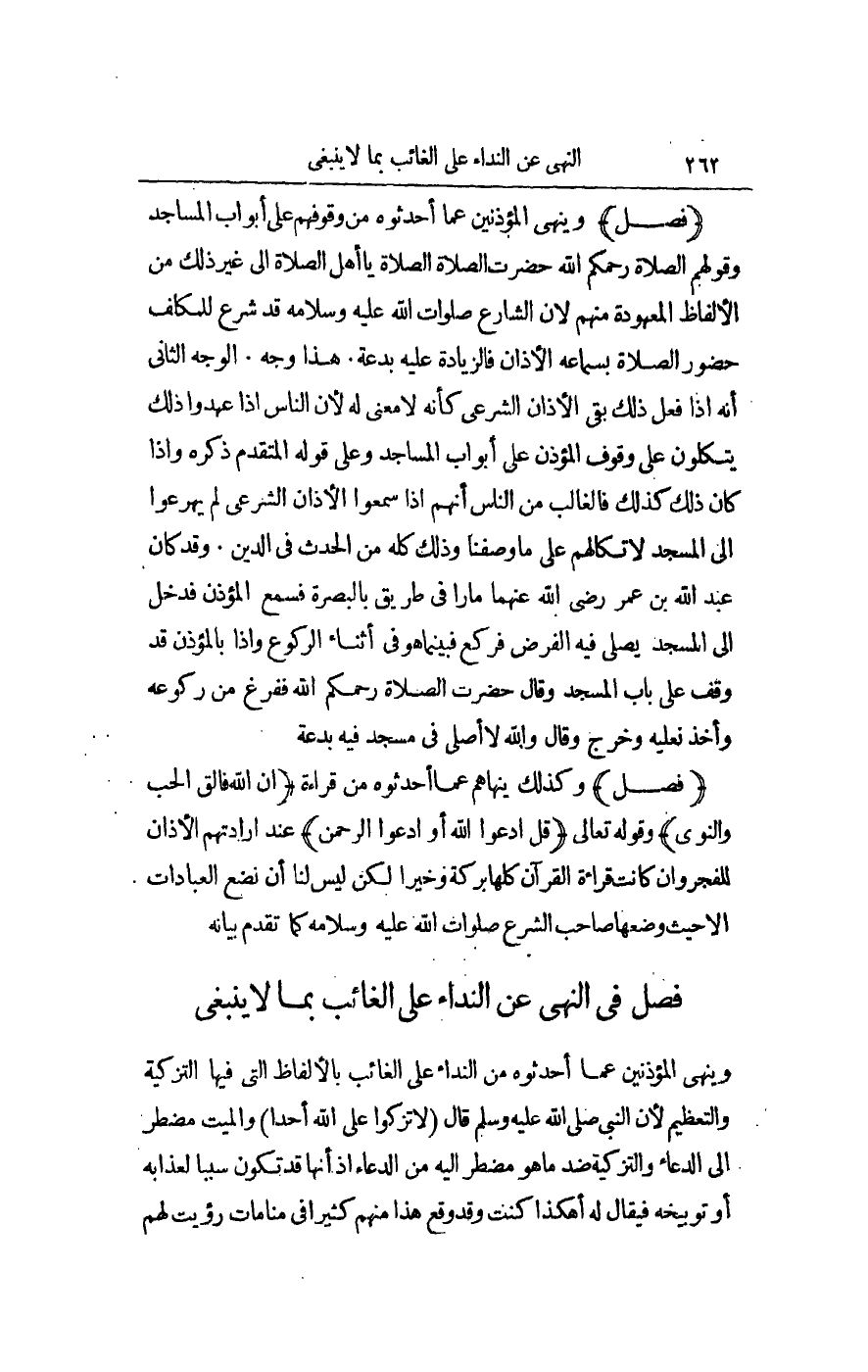 الْوَجْهُ الثَّانِي: أَنَّهُ إذَا فَعَلَ ذَلِكَ بَقِيَ الْأَذَانُ الشَّرْعِيُّ كَأَنَّهُ لَا مَعْنَى لَهُ لِأَنَّ النَّاسَ إذَا عَهِدُوا ذَلِكَ يَتَّكِلُونَ عَلَى وُقُوفِ الْمُؤَذِّنِ عَلَى أَبْوَابِ الْمَسَاجِدِ وَعَلَى قَوْلِهِ الْمُتَقَدِّمِ ذِكْرُهُ، وَإِذَا كَانَ ذَلِكَ كَذَلِكَ فَالْغَالِبُ مِنْ النَّاسِ أَنَّهُمْ إذَا سَمِعُوا الْأَذَانَ الشَّرْعِيَّ لَمْ يَهْرَعُوا إلَى الْمَسْجِدِ لِاتِّكَالِهِمْ عَلَى مَا وَصَفْنَا وَذَلِكَ كُلُّهُ مِنْ الْحَدِيثِ فِي الدِّينِ. وَقَدْ كَانَ عَبْدُ اللَّهِ بْنُ عُمَرَ - رَضِيَ اللَّهُ عَنْهُمَا - مَارًّا فِي طَرِيقٍ بِالْبَصْرَةِ فَسَمِعَ الْمُؤَذِّنَ فَدَخَلَ إلَى الْمَسْجِدِ يُصَلِّي فِيهِ الْفَرْضَ فَرَكَعَ فَبَيْنَمَا هُوَ فِي أَثْنَاءِ الرُّكُوعِ، وَإِذَا بِالْمُؤَذِّنِ قَدْ وَقَفَ عَلَى بَابِ الْمَسْجِدِ وَقَالَ حَضَرَتْ الصَّلَاةُ رَحِمَكُمْ اللَّهُ، فَفَرَغَ مِنْ رُكُوعِهِ وَأَخَذَ نَعْلَيْهِ وَخَرَجَ وَقَالَ وَاَللَّهِ لَا أُصَلِّي فِي مَسْجِدٍ فِيهِ بِدْعَةٌ.