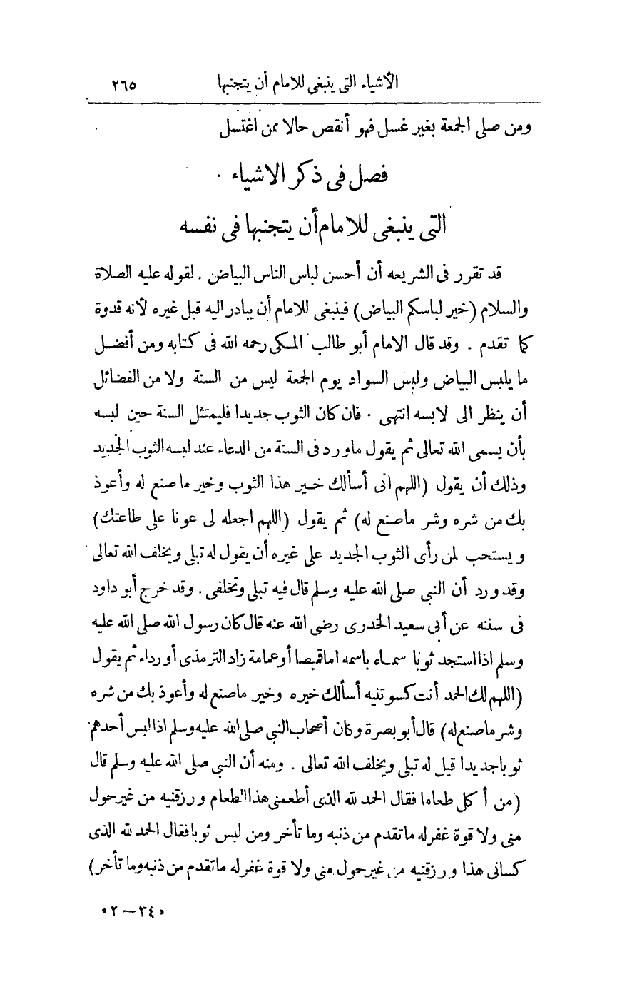 فَصْلٌ فِي ذِكْرِ الْأَشْيَاءِ الَّتِي يَنْبَغِي لِلْإِمَامِ أَنْ يَتَجَنَّبَهَا فِي نَفْسِهِ قَدْ تَقَرَّرَ فِي الشَّرِيعَةِ أَنَّ أَحْسَنَ لِبَاسِ النَّاسِ الْبَيَاضُ. لِقَوْلِهِ - عَلَيْهِ الصَّلَاةُ وَالسَّلَامُ - «خَيْرُ لِبَاسِكُمْ الْبَيَاضُ» فَيَنْبَغِي لِلْإِمَامِ أَنْ يُبَادِرَ إلَيْهِ قَبْلَ غَيْرِهِ لِأَنَّهُ قُدْوَةٌ كَمَا تَقَدَّمَ. وَقَدْ قَالَ الْإِمَامُ أَبُو طَالِبٍ الْمَكِّيُّ - رَحِمَهُ اللَّهُ - فِي كِتَابِهِ وَمِنْ أَفْضَلِ مَا يُلْبَسُ الْبَيَاضُ، وَلُبْسُ السَّوَادِ يَوْمَ الْجُمُعَةِ لَيْسَ مِنْ السُّنَّةِ وَلَا مِنْ الْفَضَائِلِ أَنْ يُنْظَرَ إلَى لَابِسِهِ انْتَهَى. فَإِنْ كَانَ الثَّوْبُ جَدِيدًا فَلْيَمْتَثِلْ السُّنَّةَ حِينَ لُبْسِهِ بِأَنْ يُسَمِّيَ اللَّهَ تَعَالَى ثُمَّ يَقُولُ مَا وَرَدَ فِي السُّنَّةِ مِنْ الدُّعَاءِ عِنْدَ لُبْسِهِ الثَّوْبَ الْجَدِيدَ وَذَلِكَ أَنْ يَقُولَ «اللَّهُمَّ إنِّي أَسْأَلُك خَيْرَ هَذَا الثَّوْبِ وَخَيْرَ مَا صُنِعَ لَهُ وَأَعُوذُ بِك مِنْ شَرِّهِ وَشَرِّ مَا صُنِعَ لَهُ» ثُمَّ يَقُولُ «اللَّهُمَّ اجْعَلْهُ لِي عَوْنًا عَلَى طَاعَتِك» وَيُسْتَحَبُّ لِمَنْ رَأَى الثَّوْبَ الْجَدِيدَ عَلَى غَيْرِهِ أَنْ يَقُولَ لَهُ تُبْلَى وَيُخْلِفُ اللَّهُ تَعَالَى، وَقَدْ وَرَدَ أَنَّ النَّبِيَّ - صَلَّى اللَّهُ عَلَيْهِ وَسَلَّمَ - قَالَ فِيهِ «تُبْلَى وَيُخْلِفُ اللَّهُ» .