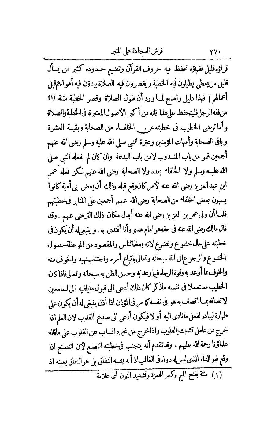 قُرَّاؤُهُ قَلِيلٌ فُقَهَاؤُهُ تُحْفَظُ فِيهِ حُرُوفُ الْقُرْآنِ وَتُضَيَّعُ حُدُودُهُ كَثِيرٌ مَنْ يَسْأَلُ قَلِيلٌ مَنْ يُعْطِي يُطِيلُونَ فِيهِ الْخُطْبَةَ وَيُقَصِّرُونَ فِيهِ الصَّلَاةَ يَبْدَءُونَ فِيهِ أَهْوَاءَهُمْ قَبْلَ أَعْمَالِهِمْ» فَهَذَا دَلِيلٌ وَاضِحٌ لِمَا وَرَدَ أَنَّ طُولَ الصَّلَاةِ وَقِصَرَ الْخُطْبَةِ مَئِنَّةٌ مِنْ فِقْهِ الرَّجُلِ فَلْيُتَحَفَّظْ عَلَى هَذَا فَإِنَّهُ مِنْ أَكْبَرِ الْأُصُولِ الْمُعْتَبَرَةِ فِي الْخُطْبَةِ وَالصَّلَاةِ.