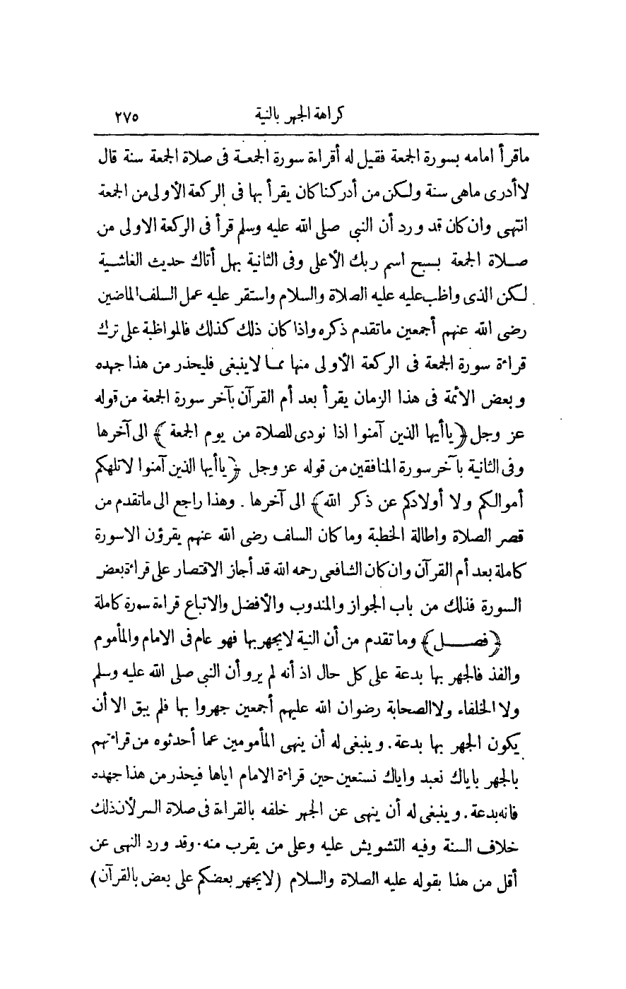 وَيَنْبَغِي لَهُ أَنْ يَنْهَى عَنْ الْجَهْرِ خَلْفَهُ بِالْقِرَاءَةِ فِي صَلَاةِ السِّرِّ لِأَنَّ ذَلِكَ خِلَافَ السُّنَّةِ وَفِيهِ التَّشْوِيشُ عَلَيْهِ وَعَلَى مَنْ يَقْرَبُ مِنْهُ. وَقَدْ وَرَدَ النَّهْيُ عَنْ أَقَلَّ مِنْ هَذَا بِقَوْلِهِ - عَلَيْهِ الصَّلَاةُ وَالسَّلَامُ - «لَا يَجْهَرْ بَعْضُكُمْ عَلَى بَعْضٍ بِالْقُرْآنِ»