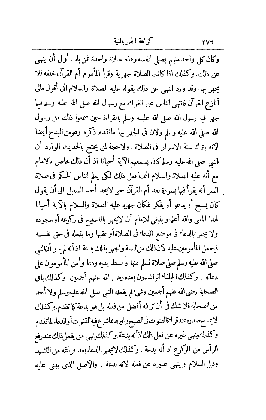 وَكَانَ كُلُّ وَاحِدٍ مِنْهُمْ يُصَلِّي لِنَفْسِهِ وَهَذِهِ صَلَاةٌ وَاحِدَةٌ فَمِنْ بَابِ أَوْلَى أَنْ يَنْهَى عَنْ ذَلِكَ. وَكَذَلِكَ إذَا كَانَتْ الصَّلَاةُ جَهْرِيَّةً وَقَرَأَ الْمَأْمُومُ أُمَّ الْقُرْآنِ خَلْفَهُ فَلَا يَجْهَرْ بِهَا. وَقَدْ وَرَدَ النَّهْيُ عَنْ ذَلِكَ بِقَوْلِهِ - عَلَيْهِ الصَّلَاةُ وَالسَّلَامُ - إنِّي أَقُولُ مَا لِي أُنَازَعُ الْقُرْآنَ فَانْتَهَى النَّاسُ عَنْ الْقِرَاءَةِ مَعَ رَسُولِ اللَّهِ - صَلَّى اللَّهُ عَلَيْهِ وَسَلَّمَ - فِيمَا جَهَرَ فِيهِ رَسُولُ اللَّهِ - صَلَّى اللَّهُ عَلَيْهِ وَسَلَّمَ - بِالْقِرَاءَةِ حِينَ سَمِعُوا ذَلِكَ مِنْ رَسُولِ اللَّهِ - صَلَّى اللَّهُ عَلَيْهِ وَسَلَّمَ -، وَلِأَنَّ فِي الْجَهْرِ بِهَا مَا تَقَدَّمَ ذِكْرُهُ وَهُوَ مِنْ الْبِدَعِ أَيْضًا لِأَنَّهُ يَتْرُكُ سُنَّةَ الْإِسْرَارِ فِي الصَّلَاةِ. وَلَا حُجَّةَ لِمَنْ يَحْتَجُّ بِالْحَدِيثِ الْوَارِدِ أَنَّ النَّبِيَّ - صَلَّى اللَّهُ عَلَيْهِ وَسَلَّمَ - كَانَ يُسْمِعُهُمْ الْآيَةَ أَحْيَانَا إذْ إنَّ ذَلِكَ خَاصٌّ بِالْإِمَامِ مَعَ أَنَّهُ - عَلَيْهِ الصَّلَاةُ وَالسَّلَامُ - إنَّمَا فَعَلَ ذَلِكَ لِكَيْ يُعْلِمَ النَّاسَ الْحُكْمَ فِي صَلَاةِ السِّرِّ أَنَّهُ يُقْرَأُ فِيهَا بِسُورَةٍ بَعْدَ أُمِّ الْقُرْآنِ حَتَّى لَا يَجِدَ أَحَدٌ السَّبِيلَ إلَى أَنْ يَقُولَ كَانَ يُسَبِّحُ أَوْ يَدْعُو أَوْ يُفَكِّرُ فَكَانَ جَهْرُهُ - عَلَيْهِ الصَّلَاةُ وَالسَّلَامُ - بِالْآيَةِ أَحْيَانَا لِهَذَا الْمَعْنَى وَاَللَّهُ أَعْلَمُ.
