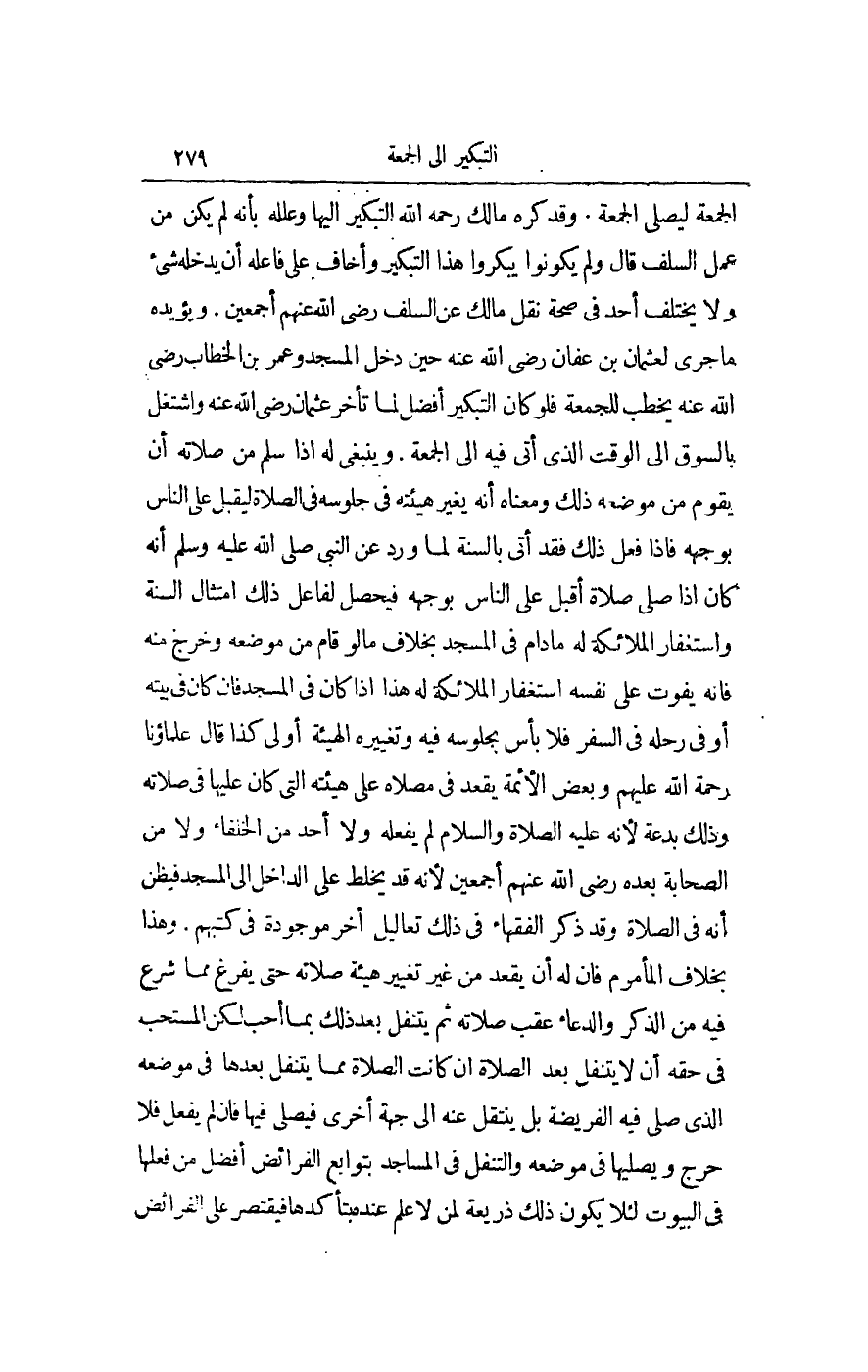 الْجُمُعَةِ لِيُصَلِّيَ الْجُمُعَةَ. وَقَدْ كَرِهَ مَالِكٌ - رَحِمَهُ اللَّهُ - التَّبْكِيرَ إلَيْهَا وَعَلَّلَهُ بِأَنَّهُ لَمْ يَكُنْ مِنْ عَمَلِ السَّلَفِ قَالَ وَلَمْ يَكُونُوا يُبَكِّرُونَ هَذَا التَّبْكِيرَ وَأَخَافُ عَلَى فَاعِلِهِ أَنْ يَدْخُلَهُ شَيْءٌ، وَلَا يَخْتَلِفُ أَحَدٌ فِي صِحَّةِ نَقْلِ مَالِكٍ عَنْ السَّلَفِ - رَضِيَ اللَّهُ عَنْهُمْ أَجْمَعِينَ -. وَيُؤَيِّدُهُ مَا جَرَى لِعُثْمَانَ بْنِ عَفَّانَ - رَضِيَ اللَّهُ عَنْهُ - حِينَ دَخَلَ الْمَسْجِدَ وَعُمَرُ بْنُ الْخَطَّابِ - رَضِيَ اللَّهُ عَنْهُ - يَخْطُبُ لِلْجُمُعَةِ فَلَوْ كَانَ التَّبْكِيرُ أَفْضَلَ لَمَا تَأَخَّرَ عُثْمَانُ - رَضِيَ اللَّهُ عَنْهُ - وَاشْتَغَلَ بِالسُّوقِ إلَى الْوَقْتِ الَّذِي أَتَى فِيهِ إلَى الْجُمُعَةِ.