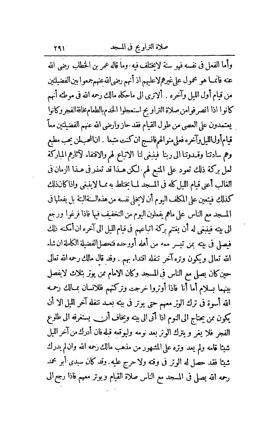 وَأَمَّا الْفِعْلُ فِي نَفْسِهِ فَهُوَ سُنَّةٌ لَا يُخْتَلَفُ فِيهِ. وَمَا قَالَهُ عُمَرُ بْنُ الْخَطَّابِ - رَضِيَ اللَّهُ عَنْهُ - فَإِنَّمَا هُوَ مَحْمُولٌ عَلَى غَيْرِهِمْ لَا عَلَيْهِمْ إذْ إنَّهُمْ - رَضِيَ اللَّهُ عَنْهُمْ - جَمَعُوا بَيْنَ الْفَضِيلَتَيْنِ مِنْ قِيَامِ أَوَّلِ اللَّيْلِ وَآخِرِهِ. أَلَا تَرَى إلَى مَا حَكَاهُ مَالِكٌ - رَحِمَهُ اللَّهُ - فِي مُوَطَّئِهِ أَنَّهُمْ كَانُوا إذَا انْصَرَفُوا مِنْ صَلَاةِ التَّرَاوِيحِ اسْتَعْجَلُوا الْخَدَمَ بِالطَّعَامِ مَخَافَةَ الْفَجْرِ وَكَانُوا يَعْتَمِدُونَ عَلَى الْعِصِيِّ مِنْ طُولِ الْقِيَامِ فَقَدْ حَازُوا - رَضِيَ اللَّهُ عَنْهُمْ - الْفَضِيلَتَيْنِ مَعًا قِيَامَ أَوَّلِ اللَّيْلِ وَآخِرِهِ فَعَلَى مِنْوَالِهِمْ فَانْسِجْ إنْ كُنْت مُتَّبِعًا. إنَّ الْمُحِبَّ لِمَنْ يُحِبُّ مُطِيعٌ وَهُمْ سَادَتُنَا وَقُدْوَتُنَا إلَى رَبِّنَا فَيَنْبَغِي لَنَا الِاتِّبَاعُ لَهُمْ وَالِاقْتِفَاءُ لِآثَارِهِمْ الْمُبَارَكَةِ لَعَلَّ بَرَكَةَ ذَلِكَ تَعُودُ عَلَى الْمُتَّبِعِ لَهُمْ، لَكِنْ هَذَا قَدْ تَعَذَّرَ فِي هَذَا الزَّمَانِ فِي الْغَالِبِ أَعْنِي قِيَامَ اللَّيْلِ كُلِّهِ فِي الْمَسْجِدِ لِمَا يَخْتَلِطُ بِهِ مِمَّا لَا يَنْبَغِي، وَإِذَا كَانَ ذَلِكَ كَذَلِكَ فَيَتَعَيَّنُ عَلَى الْمُكَلَّفِ الْيَوْمَ أَنْ لَا يُخْلِيَ نَفْسَهُ مِنْ هَذِهِ السُّنَّةِ أَلْبَتَّةَ بَلْ يَفْعَلُهَا فِي الْمَسْجِدِ مَعَ النَّاسِ عَلَى مَا هُمْ يَفْعَلُونَ الْيَوْمَ مِنْ التَّخْفِيفِ فِيهَا فَإِذَا فَرَغُوا وَرَجَعَ إلَى بَيْتِهِ فَيَنْبَغِي لَهُ أَنْ يَغْتَنِمَ بَرَكَةَ اتِّبَاعِهِمْ فِي قِيَامِ اللَّيْلِ إلَى آخِرِهِ إنْ أَمْكَنَهُ ذَلِكَ فَيُصَلِّي فِي بَيْتِهِ بِمَنْ تَيَسَّرَ مَعَهُ مِنْ أَهْلِهِ أَوْ وَحْدَهُ فَتَحْصُلُ الْفَضِيلَةُ الْكَامِلَةُ إنْ شَاءَ اللَّهُ تَعَالَى، وَيَكُونُ وَتْرُهُ آخِرَ تَنَفُّلِهِ اقْتِدَاءً بِهِمْ. وَقَدْ قَالَ مَالِكٌ - رَحِمَهُ اللَّهُ تَعَالَى - حِينَ كَانَ يُصَلِّي مَعَ النَّاسِ فِي الْمَسْجِدِ وَكَانَ الْإِمَامُ مِمَّنْ يُوتِرُ بِثَلَاثٍ لَا يَفْصِلُ بَيْنَهُمَا بِسَلَامٍ، أَمَّا أَنَا فَإِذَا أَوْتَرُوا خَرَجْت وَتَرَكْتُهُمْ فَلِلْإِنْسَانِ بِمَالِكٍ - رَحِمَهُ اللَّهُ - أُسْوَةُ فِي تَرْكِ الْوِتْرِ مَعَهُمْ حَتَّى يُوتِرَ فِي بَيْتِهِ بَعْدَ تَنَفُّلِهِ آخِرَ اللَّيْلِ إلَّا أَنْ يَكُونَ مِمَّنْ يَحْتَاجُ إلَى النَّوْمِ إذَا آتَى إلَى بَيْتِهِ، وَيَخَافُ أَنْ يَسْتَغْرِقَهُ إلَى طُلُوعِ الْفَجْرِ فَلَا يُغَرُّ وَيَتْرُكْ الْوِتْرَ بَعْدَ نَوْمِهِ وَلْيُوقِعْهُ قَبْلَهُ، فَإِنْ أَدْرَكَ مِنْ آخِرِ اللَّيْلِ شَيْئًا قَامَهُ وَلَمْ يُعِدْ وِتْرَهُ عَلَى الْمَشْهُورِ مِنْ مَذْهَبِ مَالِكٍ - رَحِمَهُ اللَّهُ -، وَإِنْ لَمْ يُدْرِكْ شَيْئًا فَقَدْ حَصَلَ لَهُ الْوِتْرُ فِي وَقْتِهِ وَلَا حَرَجَ عَلَيْهِ. وَقَدْ كَانَ سَيِّدِي أَبُو مُحَمَّدٍ - رَحِمَهُ اللَّهُ - يُصَلِّي فِي الْمَسْجِدِ مَعَ النَّاسِ صَلَاةَ الْقِيَامِ وَيُوتِرُ مَعَهُمْ فَإِذَا رَجَعَ إلَى