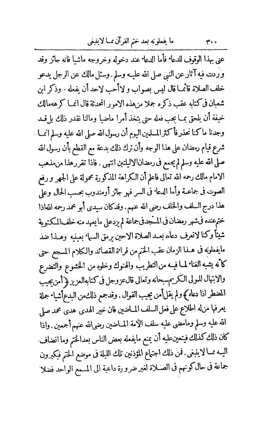 وَسُئِلَ مَالِكٌ عَنْ الرَّجُلِ يَدْعُو خَلْفَ الصَّلَاةِ قَائِمًا قَالَ لَيْسَ بِصَوَابٍ وَلَا أُحِبُّ لِأَحَدٍ أَنْ يَفْعَلَهُ. وَذَكَرَ ابْنُ شَعْبَانَ فِي كِتَابِهِ عَقِبَ ذِكْرِهِ جُمَلًا مِنْ هَذِهِ الْأُمُورِ الْمُحْدَثَةِ قَالَ إنَّمَا كَرِهَهُ مَالِكٌ خِيفَةَ أَنْ يُلْحَقَ بِمَا يَجِبُ فِعْلُهُ حَتَّى يُتَّخَذَ أَمْرًا مَاضِيًا وَمَا لَنَا نُقَدِّرُ ذَلِكَ بَلْ قَدْ وَجَدْنَا مَا كُنَّا نَحْذَرُ فَأَكْثَرُ الْمُسْلِمِينَ الْيَوْمَ أَنَّ رَسُولَ اللَّهِ - صَلَّى اللَّهُ عَلَيْهِ وَسَلَّمَ - إنَّمَا شَرَعَ قِيَامَ رَمَضَانَ عَلَى هَذَا الْوَجْهِ وَأَنَّ تَرْكَ ذَلِكَ بِدْعَةٌ مَعَ الْقَطْعِ بِأَنَّ رَسُولَ اللَّهِ - صَلَّى اللَّهُ عَلَيْهِ وَسَلَّمَ - لَمْ يَجْمَعْ فِي رَمَضَانَ إلَّا لَيْلَتَيْنِ انْتَهَى. فَإِذَا تَقَرَّرَ هَذَا مِنْ مَذْهَبِ الْإِمَامِ مَالِكٍ - رَحِمَهُ اللَّهُ تَعَالَى - فَاعْلَمْ أَنَّ الْكَرَاهَةَ الْمَذْكُورَةَ مَحْمُولَةٌ عَلَى الْجَهْرِ وَرَفْعِ الصَّوْتِ فِي جَمَاعَةٍ