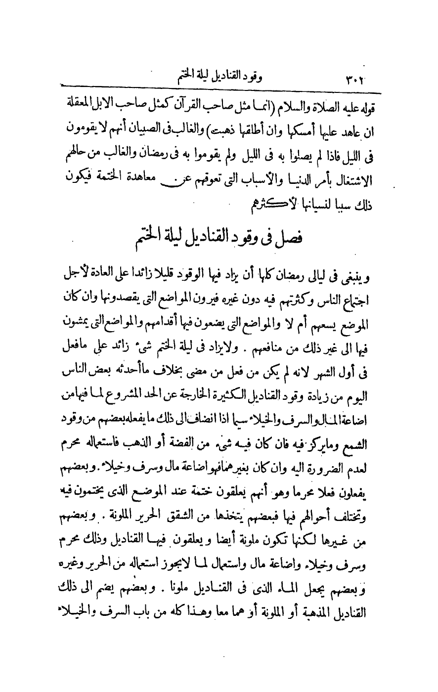 ِ وَيَنْبَغِي فِي لَيَالِي رَمَضَانَ كُلِّهَا أَنْ يُزَادَ فِيهَا الْوُقُودُ قَلِيلًا زَائِدًا عَلَى الْعَادَةِ لِأَجْلِ اجْتِمَاعِ النَّاسِ وَكَثْرَتِهِمْ فِيهِ دُونَ غَيْرِهِ فَيَرَوْنَ الْمَوَاضِعَ الَّتِي يَقْصِدُونَهَا، وَإِنْ كَانَ الْمَوْضِعُ يَسَعُهُمْ أَمْ لَا وَالْمَوَاضِعَ الَّتِي يَضَعُونَ فِيهَا أَقْدَامَهُمْ وَالْمَوَاضِعَ الَّتِي يَمْشُونَ فِيهَا إلَى غَيْرِ ذَلِكَ مِنْ مَنَافِعِهِمْ. وَلَا يُزَادُ فِي لَيْلَةِ الْخَتْمِ شَيْءٌ زَائِدٌ عَلَى مَا فُعِلَ فِي أَوَّلِ الشَّهْرِ؛ لِأَنَّهُ لَمْ يَكُنْ مِنْ فِعْلِ مَنْ مَضَى بِخِلَافِ مَا أَحْدَثَهُ بَعْضُ النَّاسِ الْيَوْمَ مِنْ زِيَادَةِ وُقُودِ الْقَنَادِيلِ الْكَثِيرَةِ الْخَارِجَةِ عَنْ الْحَدِّ الْمَشْرُوعِ لِمَا فِيهَا مِنْ إضَاعَةِ الْمَالِ وَالسَّرَفِ وَالْخُيَلَاءِ سِيَّمَا إذَا انْضَافَ إلَى ذَلِكَ مَا يَفْعَلُهُ بَعْضُهُمْ مِنْ وُقُودِ الشَّمْعِ وَمَا يُرْكَزُ فِيهِ، فَإِنْ كَانَ فِيهِ شَيْءٌ مِنْ الْفِضَّةِ أَوْ الذَّهَبِ فَاسْتِعْمَالُهُ مُحَرَّمٌ لِعَدَمِ الضَّرُورَةِ إلَيْهِ وَإِنْ كَانَ بِغَيْرِهِمَا فَهُوَ إضَاعَةُ مَالٍ وَسَرَفٌ وَخُيَلَاءُ.