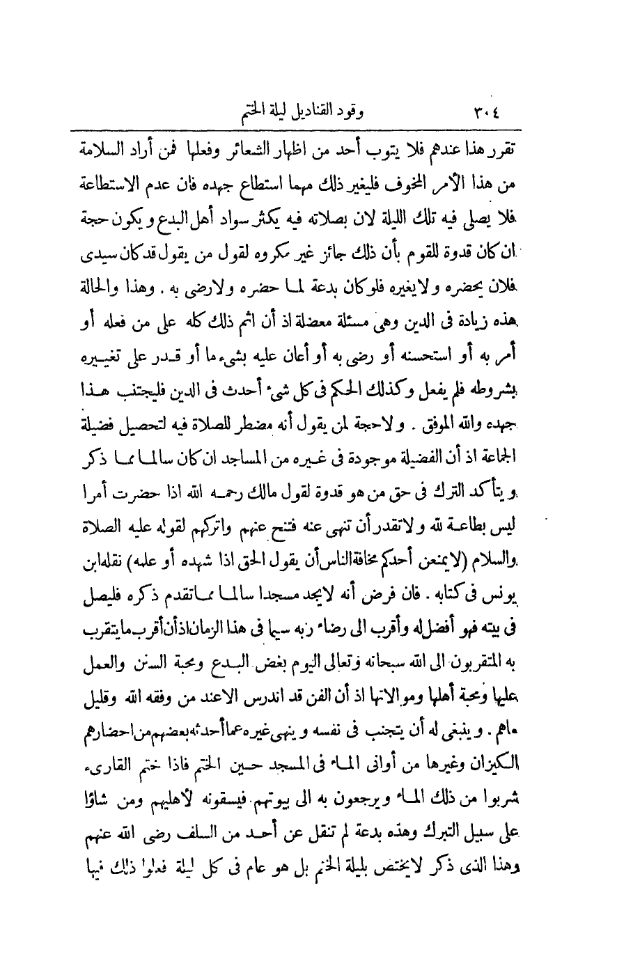 تَقَرَّرَ هَذَا عِنْدَهُمْ فَلَا يَتُوبُ أَحَدٌ مِنْ إظْهَارِ الشَّعَائِرِ وَفِعْلِهَا فَمَنْ أَرَادَ السَّلَامَةَ مِنْ هَذَا الْأَمْرِ الْمَخُوفِ فَلْيُغَيِّرْ ذَلِكَ مَهْمَا اسْتَطَاعَ جَهْدَهُ، فَإِنْ عَدِمَ الِاسْتِطَاعَةَ فَلَا يُصَلِّي فِيهِ تِلْكَ اللَّيْلَةَ؛ لِأَنَّ بِصَلَاتِهِ فِيهِ يَكْثُرُ سَوَادُ أَهْلِ الْبِدَعِ وَيَكُونُ حُجَّةً إنْ كَانَ قُدْوَةً لِلْقَوْمِ بِأَنَّ ذَلِكَ جَائِزٌ غَيْرُ مَكْرُوهٍ لِقَوْلِ مَنْ يَقُولُ قَدْ كَانَ سَيِّدِي فُلَانٌ يَحْضُرُهُ وَلَا يُغَيِّرُهُ فَلَوْ كَانَ بِدْعَةً لَمَا حَضَرَهُ وَلَا رَضِيَ بِهِ. وَهَذَا وَالْحَالَةُ هَذِهِ زِيَادَةٌ فِي الدِّينِ وَهِيَ مَسْأَلَةٌ مُعْضِلَةٌ إذْ إنَّ إثْمَ ذَلِكَ كُلِّهِ عَلَى مَنْ فَعَلَهُ أَوْ أَمَرَ بِهِ أَوْ اسْتَحْسَنَهُ أَوْ رَضِيَ بِهِ أَوْ أَعَانَ عَلَيْهِ بِشَيْءٍ مَا أَوْ قَدَرَ عَلَى تَغْيِيرِهِ بِشُرُوطِهِ فَلَمْ يَفْعَلْ وَكَذَلِكَ الْحُكْمُ فِي كُلِّ شَيْءٍ أُحْدِثَ فِي الدِّينِ فَلْيَجْتَنِبْ هَذَا جَهْدَهُ وَاَللَّهُ الْمُوَفِّقُ. وَلَا حُجَّةَ لِمَنْ يَقُولُ إنَّهُ مُضْطَرٌّ لِلصَّلَاةِ فِيهِ لِتَحْصِيلِ فَضِيلَةِ الْجَمَاعَةِ إذْ إنَّ الْفَضِيلَةَ مَوْجُودَةٌ فِي غَيْرِهِ مِنْ الْمَسَاجِدِ إنْ كَانَ سَالِمًا مِمَّا ذُكِرَ وَيَتَأَكَّدُ التَّرْكُ فِي حَقِّ مَنْ هُوَ قُدْوَةٌ لِقَوْلِ مَالِكٍ - رَحِمَهُ اللَّهُ تَعَالَى - إذَا حَضَرْت أَمْرًا لَيْسَ بِطَاعَةٍ لِلَّهِ وَلَا تَقْدِرُ أَنْ تَنْهَى عَنْهُ فَتَنَحَّ عَنْهُمْ وَاتْرُكْهُمْ لِقَوْلِهِ - عَلَيْهِ الصَّلَاةُ وَالسَّلَامُ - «لَا يَمْنَعَنَّ أَحَدَكُمْ مَخَافَةُ النَّاسِ أَنْ يَقُولَ الْحَقَّ إذَا شَهِدَهُ أَوْ عَلِمَهُ» نَقَلَهُ ابْنُ يُونُسَ فِي كِتَابِهِ.