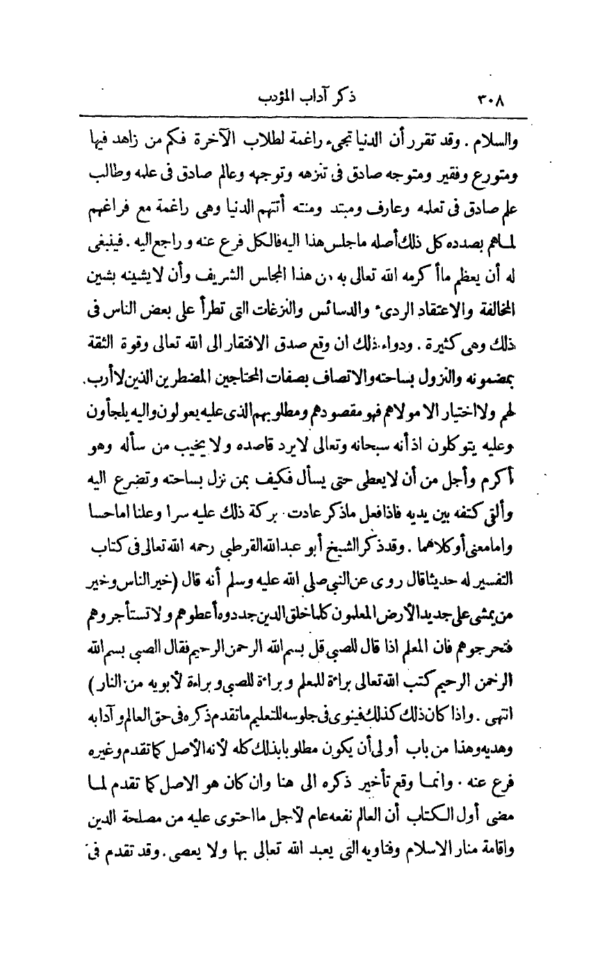 وَقَدْ تَقَرَّرَ أَنَّ الدُّنْيَا تَجِيءُ رَاغِمَةً لِطُلَّابِ الْآخِرَةِ فَكَمْ مِنْ زَاهِدٍ فِيهَا وَمُتَوَرِّعٍ وَفَقِيرٍ وَمُتَوَجِّهٍ صَادِقٍ فِي تَنَزُّهِهِ وَتَوَجُّهِهِ وَعَالِمٍ صَادِقٍ فِي عِلْمِهِ وَطَالِبِ عِلْمٍ صَادِقٍ فِي تَعَلُّمِهِ وَعَارِفٍ وَمُبْتَدٍ وَمُنْتَهٍ أَتَتْهُمْ الدُّنْيَا وَهِيَ رَاغِمَةٌ مَعَ فَرَاغِهِمْ لِمَا هُمْ بِصَدَدِهِ كُلُّ ذَلِكَ أَصْلُهُ مَا جَلَسَ هَذَا إلَيْهِ فَالْكُلُّ فَرْعٌ عَنْهُ وَرَاجِعٌ إلَيْهِ. فَيَنْبَغِي لَهُ أَنْ يُعَظِّمَ مَا أَكْرَمَهُ اللَّهُ تَعَالَى بِهِ مِنْ هَذَا الْمَجْلِسِ الشَّرِيفِ وَأَنْ لَا يَشِينَهُ بِشَيْنِ الْمُخَالَفَةِ وَالِاعْتِقَادِ الرَّدِيءِ وَالدَّسَائِسِ وَالنَّزَغَاتِ الَّتِي تَطْرَأُ عَلَى بَعْضِ النَّاسِ فِي ذَلِكَ وَهِيَ كَثِيرَةٌ. وَدَوَاءُ ذَلِكَ إنْ وَقَعَ صِدْقُ الِافْتِقَارِ إلَى اللَّهِ تَعَالَى وَقُوَّةُ الثِّقَةِ بِمَضْمُونِهِ وَالنُّزُولُ بِسَاحَتِهِ وَالِاتِّصَافُ بِصِفَاتِ الْمُحْتَاجِينَ الْمُضْطَرِّينَ الَّذِينَ لَا أَرَبَ لَهُمْ وَلَا اخْتِيَارَ إلَّا مَوْلَاهُمْ فَهُوَ مَقْصُودُهُمْ وَمَطْلُوبُهُمْ الَّذِي عَلَيْهِ يُعَوِّلُونَ وَإِلَيْهِ يَلْجَئُونَ وَعَلَيْهِ يَتَوَكَّلُونَ إذْ إنَّهُ سُبْحَانَهُ وَتَعَالَى لَا يَرُدُّ قَاصِدَهُ وَلَا يُخَيِّبُ مَنْ سَأَلَهُ وَهُوَ أَكْرَمُ وَأَجَلُّ مِنْ أَنْ لَا يُعْطِيَ حَتَّى يُسْأَلَ فَكَيْفَ بِمَنْ نَزَلَ بِسَاحَتِهِ وَتَضَرَّعَ إلَيْهِ وَأَلْقَى كَتِفَهُ بَيْنَ يَدَيْهِ فَإِذَا فَعَلَ مَا ذُكِرَ عَادَتْ بَرَكَةُ ذَلِكَ عَلَيْهِ سِرًّا وَعَلَنًا إمَّا حِسًّا وَإِمَّا مَعْنًى أَوْ كِلَاهُمَا. وَقَدْ ذَكَرَ الشَّيْخُ أَبُو عَبْدِ اللَّهِ الْقُرْطُبِيُّ - رَحِمَهُ اللَّهُ تَعَالَى - فِي كِتَابِ التَّفْسِيرِ لَهُ حَدِيثًا قَالَ رُوِيَ عَنْ النَّبِيِّ - صَلَّى اللَّهُ عَلَيْهِ وَسَلَّمَ - أَنَّهُ قَالَ «خَيْرُ النَّاسِ وَخَيْرُ مَنْ يَمْشِي عَلَى جَدِيدِ الْأَرْضِ الْمُعَلِّمُونَ كُلَّمَا خَلِقَ الدِّينُ جَدَّدُوهُ أَعْطُوهُمْ وَلَا تَسْتَأْجِرُوهُمْ فَتُحْرِجُوهُمْ فَإِنَّ الْمُعَلِّمَ إذَا قَالَ لِلصَّبِيِّ قُلْ بِسْمِ اللَّهِ الرَّحْمَنِ الرَّحِيمِ فَقَالَ الصَّبِيُّ بِسْمِ اللَّهِ الرَّحْمَنِ الرَّحِيمِ كَتَبَ اللَّهُ تَعَالَى بَرَاءَةً لِلْمُعَلِّمِ وَبَرَاءَةً لِلصَّبِيِّ وَبَرَاءَةً لِأَبَوَيْهِ مِنْ النَّارِ» انْتَهَى. وَإِذَا كَانَ ذَلِكَ كَذَلِكَ فَيَنْوِي فِي جُلُوسِهِ لِلتَّعْلِيمِ مَا تَقَدَّمَ ذِكْرُهُ فِي حَقِّ الْعَالِمِ وَآدَابِهِ وَهَدْيِهِ وَهَذَا مِنْ بَابِ أَوْلَى أَنْ يَكُونَ مَطْلُوبًا بِذَلِكَ كُلِّهِ؛ لِأَنَّهُ الْأَصْلُ كَمَا تَقَدَّمَ وَغَيْرُهُ فَرْعٌ عَنْهُ. وَإِنَّمَا وَقَعَ تَأْخِيرُ ذِكْرِهِ إلَى هُنَا، وَإِنْ كَانَ هُوَ الْأَصْلَ كَمَا تَقَدَّمَ لِمَا مَضَى أَوَّلَ الْكِتَابِ أَنَّ الْعَالِمَ نَفْعُهُ عَامٌّ لِأَجْلِ مَا احْتَوَى عَلَيْهِ مِنْ مَصْلَحَةِ الدِّينِ وَإِقَامَةِ مَنَارِ الْإِسْلَامِ وَفَتَاوِيه الَّتِي يُعْبَدُ اللَّهُ تَعَالَى بِهَا وَلَا يُعْصَى. وَقَدْ تَقَدَّمَ فِي