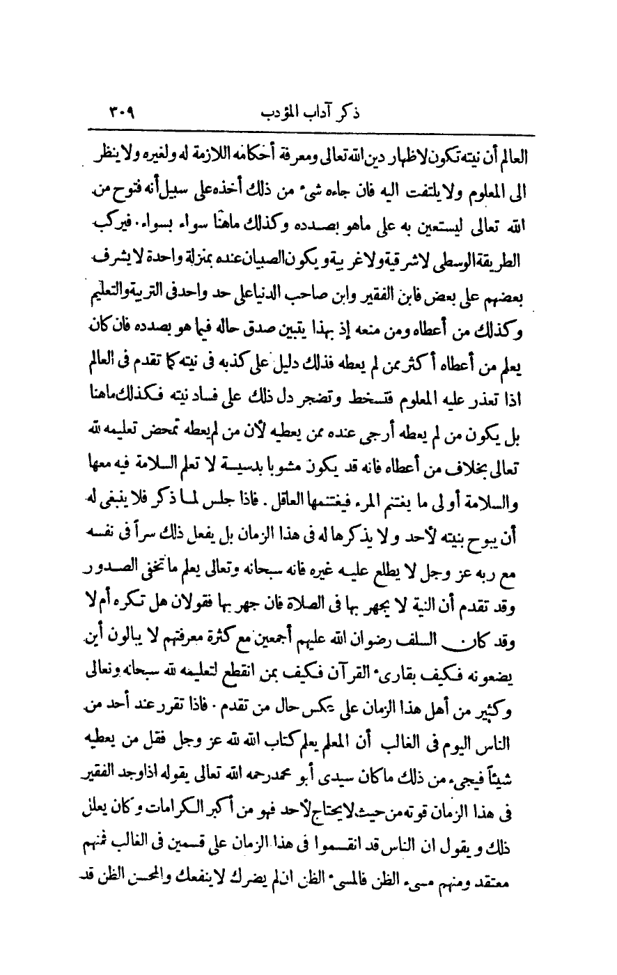 الْعَالِمِ أَنَّ نِيَّتَهُ تَكُونُ لِإِظْهَارِ دِينِ اللَّهِ تَعَالَى وَمَعْرِفَةِ أَحْكَامِهِ اللَّازِمَةِ لَهُ وَلِغَيْرِهِ وَلَا يَنْظُرُ إلَى الْمَعْلُومِ وَلَا يَلْتَفِتُ إلَيْهِ، فَإِنْ جَاءَهُ شَيْءٌ مِنْ ذَلِكَ أَخَذَهُ عَلَى سَبِيلِ أَنَّهُ فُتُوحٌ مِنْ اللَّهِ تَعَالَى لِيَسْتَعِينَ بِهِ عَلَى مَا هُوَ بِصَدَدِهِ وَكَذَلِكَ مَا هُنَا سَوَاءً بِسَوَاءٍ. فَيَرْكَبُ الطَّرِيقَةَ الْوُسْطَى لَا شَرْقِيَّةً وَلَا غَرْبِيَّةً وَيَكُونُ الصِّبْيَانُ عِنْدَهُ بِمَنْزِلَةٍ وَاحِدَةٍ لَا يُشَرِّفُ بَعْضَهُمْ عَلَى بَعْضٍ فَابْنُ الْفَقِيرِ وَابْنُ صَاحِبِ الدُّنْيَا عَلَى حَدٍّ وَاحِدٍ فِي التَّرْبِيَةِ وَالتَّعْلِيمِ وَكَذَلِكَ مَنْ أَعْطَاهُ وَمَنْ مَنَعَهُ إذْ بِهَذَا يَتَبَيَّنُ صِدْقُ حَالِهِ فِيمَا هُوَ بِصَدَدِهِ، فَإِنْ كَانَ يَعْلَمُ مَنْ أَعْطَاهُ أَكْثَرَ مِمَّنْ لَمْ يُعْطِهِ فَذَلِكَ دَلِيلٌ عَلَى كَذِبِهِ فِي نِيَّتِهِ كَمَا تَقَدَّمَ فِي الْعَالِمِ إذَا تَعَذَّرَ عَلَيْهِ الْمَعْلُومُ فَتَسَخَّطَ وَتَضَجَّرَ دَلَّ ذَلِكَ عَلَى فَسَادِ نِيَّتِهِ فَكَذَلِكَ مَا هُنَا بَلْ يَكُونُ مَنْ لَمْ يُعْطِهِ أَرْجَى عِنْدَهُ مِمَّنْ يُعْطِيه؛ لِأَنَّ مَنْ لَمْ يُعْطِهِ تَمَحَّصَ تَعْلِيمُهُ لِلَّهِ تَعَالَى بِخِلَافِ مَنْ أَعْطَاهُ فَإِنَّهُ قَدْ يَكُونُ مَشُوبًا بِدَسِيسَةٍ لَا تُعْلَمُ السَّلَامَةُ فِيهِ مَعَهَا وَالسَّلَامَةُ أَوْلَى مَا يَغْتَنِمُ الْمَرْءُ فَيَغْتَنِمُهَا الْعَاقِلُ. فَإِذَا جَلَسَ لِمَا ذُكِرَ فَلَا يَنْبَغِي لَهُ أَنْ يَبُوحَ بِنِيَّتِهِ لِأَحَدٍ وَلَا يَذْكُرُهَا لَهُ فِي هَذَا الزَّمَانِ بَلْ يَفْعَلُ ذَلِكَ سِرًّا فِي نَفْسِهِ مَعَ رَبِّهِ عَزَّ وَجَلَّ لَا يُطْلِعُ عَلَيْهِ غَيْرَهُ فَإِنَّهُ سُبْحَانَهُ وَتَعَالَى يَعْلَمُ مَا تُخْفِي الصُّدُورُ وَقَدْ تَقَدَّمَ أَنَّ النِّيَّةَ لَا يُجْهَرُ بِهَا فِي الصَّلَاةِ، فَإِنْ جُهِرَ بِهَا فَقَوْلَانِ هَلْ تُكْرَهُ أَمْ لَا وَقَدْ كَانَ السَّلَفُ - رِضْوَانُ اللَّهِ عَلَيْهِمْ أَجْمَعِينَ - مَعَ كَثْرَةِ مَعْرِفَتِهِمْ لَا يُبَالُونَ أَيْنَ يَضَعُونَهُ فَكَيْفَ بِقَارِئِ الْقُرْآنِ فَكَيْفَ بِمَنْ انْقَطَعَ لِتَعْلِيمِهِ لِلَّهِ سُبْحَانَهُ وَتَعَالَى وَكَثِيرٌ مِنْ أَهْلِ هَذَا الزَّمَانِ عَلَى عَكْسِ حَالِ مَنْ تَقَدَّمَ. فَإِذَا تَقَرَّرَ عِنْدَ أَحَدٍ مِنْ النَّاسِ الْيَوْمَ فِي الْغَالِبِ أَنَّ الْمُعَلِّمَ يُعَلِّمُ كِتَابَ اللَّهِ لِلَّهِ عَزَّ وَجَلَّ فَقَلَّ مَنْ يُعْطِيه شَيْئًا فَيَجِيءُ مِنْ ذَلِكَ مَا كَانَ سَيِّدِي أَبُو مُحَمَّدٍ - رَحِمَهُ اللَّهُ تَعَالَى - يَقُولُهُ إذَا وَجَدَ الْفَقِيرُ فِي هَذَا الزَّمَانِ قُوتَهُ مِنْ حَيْثُ لَا يَحْتَاجُ لِأَحَدٍ فَهُوَ مِنْ أَكْبَرِ الْكَرَامَاتِ وَكَانَ يُعَلِّلُ ذَلِكَ وَيَقُولُ إنَّ النَّاسَ قَدْ انْقَسَمُوا فِي هَذَا الزَّمَانِ عَلَى قِسْمَيْنِ فِي الْغَالِبِ فَمِنْهُمْ مُعْتَقِدٌ وَمِنْهُمْ مُسِيءُ الظَّنِّ فَالْمُسِيءُ الظَّنِّ إنْ لَمْ يَضُرَّك لَا يَنْفَعُك وَالْمُحْسِنُ الظَّنِّ قَدْ