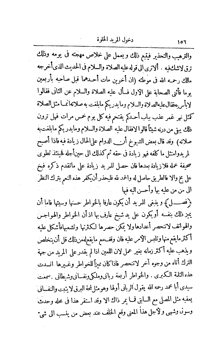 : (فَصْلٌ) : وَيَنْبَغِي لِلْمُرِيدِ أَنْ يَكُونَ عَارِفًا بِالْخَوَاطِرِ حَسَنِهَا، وَسَيِّئِهَا فَإِمَّا أَنْ يُمَيِّزَ ذَلِكَ بِنَفْسِهِ أَوْ يَكُونَ عَلَى يَدِ شَيْخٍ عَارِفٍ بِهَا إذْ إنَّ الْخَوَاطِرَ، وَالْهَوَاجِسَ، وَالْهَوَاتِفَ لَا تَنْحَصِرُ أَعْدَادُهَا، وَلَا يُمْكِنُ حَصْرُهَا لِكَثْرَتِهَا، وَتَشَعُّبِهَا فَأَشْكَلَ عَلَيْهِ أَكْثَرُ مَا يَقَعُ مِنْهَا، وَتَلَبَّسَ الْأَمْرُ عَلَيْهِ فَإِنْ وَقَفَ مَعَ مَا يَقَعُ لَهُ مِنْ ذَلِكَ قَلَّ أَنْ يَتَخَلَّصَ وَيَذْهَبَ عَلَيْهِ أَكْثَرُ زَمَانِهِ بِغَيْرِ عَمَلٍ؛ لِأَنَّ اللَّعِينَ إذَا لَمْ يَقْدِرْ عَلَى الْمُرِيدِ مِنْ جِهَةِ التَّرْكِ أَتَاهُ مِنْ وُجُوهٍ أُخَرَ لَا تَنْحَصِرُ فَإِذَا كَانَ مُمَيِّزًا لِلْخَوَاطِرِ، وَغَيْرِهَا انْسَدَّتْ هَذِهِ الثُّلْمَةُ الْكُبْرَى.