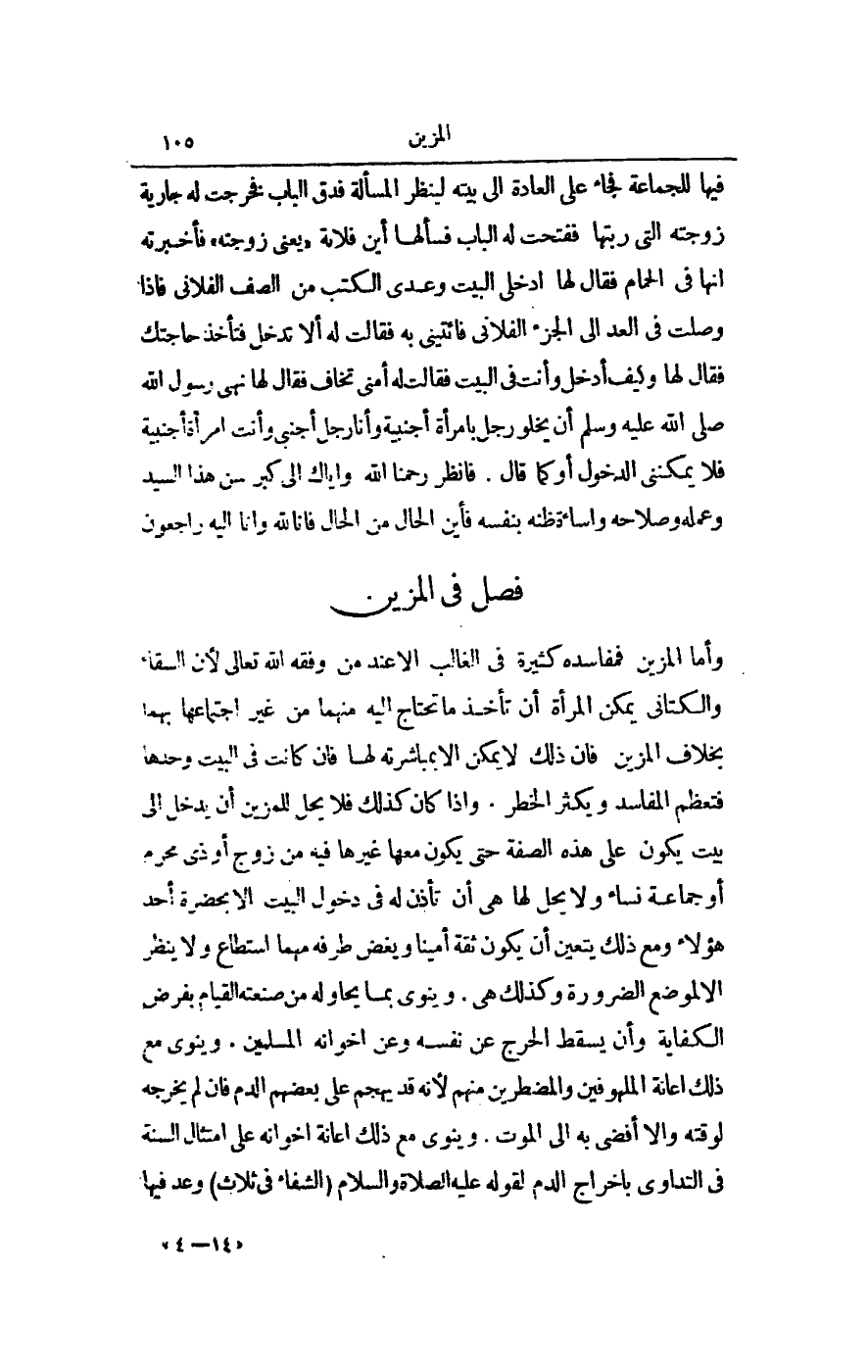 وَأَمَّا الْمُزَيِّنُ فَمَفَاسِدُهُ كَثِيرَةٌ فِي الْغَالِبِ إلَّا عِنْدَ مَنْ وَفَّقَهُ اللَّهُ تَعَالَى؛ لِأَنَّ السَّقَّاءَ وَالْكَتَّانِيَّ يُمْكِنُ الْمَرْأَةُ أَنْ تَأْخُذَ مَا تَحْتَاجُ إلَيْهِ مِنْهُمَا مِنْ غَيْرِ اجْتِمَاعِهَا بِهِمَا بِخِلَافِ الْمُزَيِّنِ فَإِنَّ ذَلِكَ لَا يُمْكِنُ إلَّا بِمُبَاشَرَتِهِ لَهَا فَإِنْ كَانَتْ فِي الْبَيْتِ وَحْدَهَا فَتَعْظُمُ الْمَفَاسِدُ وَيَكْثُرُ الْخَطَرُ. وَإِذَا كَانَ كَذَلِكَ فَلَا يَحِلُّ لِلْمُزَيِّنِ أَنْ يَدْخُلَ إلَى بَيْتٍ يَكُونُ عَلَى هَذِهِ الصِّفَةِ حَتَّى يَكُونَ مَعَهَا غَيْرُهَا فِيهِ مِنْ زَوْجٍ أَوْ ذِي مَحْرَمٍ أَوْ جَمَاعَةِ نِسَاءٍ، وَلَا يَحِلُّ لَهَا هِيَ أَنْ تَأْذَنَ لَهُ فِي دُخُولِ الْبَيْتِ إلَّا بِحَضْرَةِ أَحَدِ هَؤُلَاءِ وَمَعَ ذَلِكَ يَتَعَيَّنُ أَنْ يَكُونَ ثِقَةً أَمِينًا وَيَغُضَّ طَرْفَهُ مَهْمَا اسْتَطَاعَ، وَلَا يَنْظُرَ إلَّا لِمَوْضِعِ الضَّرُورَةِ، وَكَذَلِكَ هِيَ. وَيَنْوِي بِمَا يُحَاوِلُهُ مِنْ صَنْعَتِهِ الْقِيَامَ بِفَرْضِ الْكِفَايَةِ وَأَنْ يُسْقِطَ الْحَرَجَ عَنْ نَفْسِهِ وَعَنْ إخْوَانِهِ الْمُسْلِمِينَ. وَيَنْوِي مَعَ ذَلِكَ إعَانَةَ الْمَلْهُوفِينَ وَالْمُضْطَرِّينَ مِنْهُمْ؛ لِأَنَّهُ قَدْ يَهْجُمُ عَلَى بَعْضِهِمْ الدَّمُ فَإِنْ لَمْ يُخْرِجْهُ لِوَقْتِهِ وَإِلَّا أَفْضَى بِهِ إلَى الْمَوْتِ. وَيَنْوِي مَعَ ذَلِكَ إعَانَةَ إخْوَانِهِ عَلَى امْتِثَالِ السُّنَّةِ فِي التَّدَاوِي بِإِخْرَاجِ الدَّمِ لِقَوْلِهِ - عَلَيْهِ الصَّلَاةُ وَالسَّلَامُ - «الشِّفَاءُ فِي ثَلَاثٍ» وَعَدَّ فِيهَا