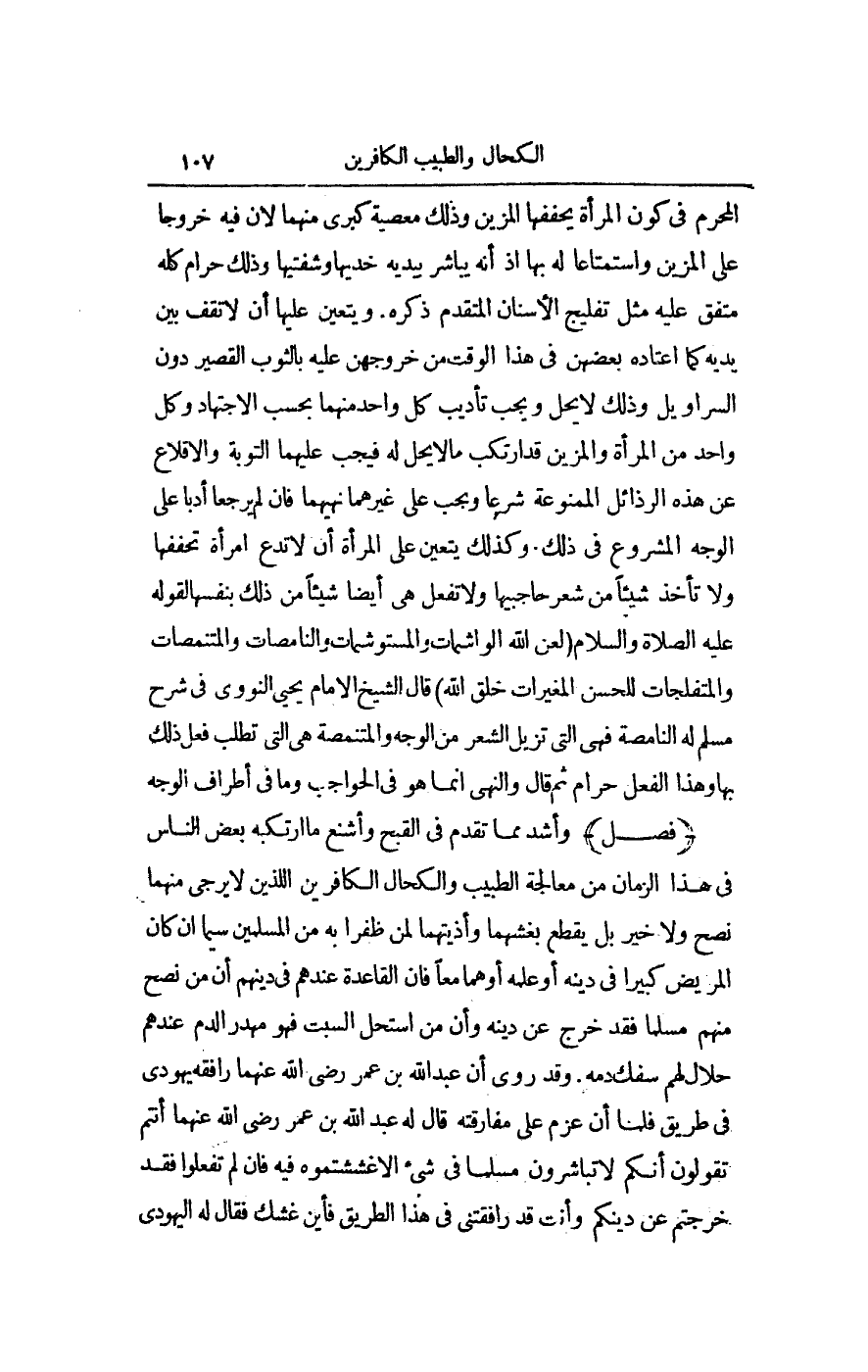 (فَصْلٌ) وَأَشَدُّ مِمَّا تَقَدَّمَ فِي الْقُبْحِ وَأَشْنَعُ مَا ارْتَكَبَهُ بَعْضُ النَّاسِ فِي هَذَا الزَّمَانِ مِنْ مُعَالَجَةِ الطَّبِيبِ وَالْكَحَّالِ الْكَافِرَيْنِ اللَّذَيْنِ لَا يُرْجَى مِنْهُمَا نُصْحٌ، وَلَا خَيْرٌ بَلْ يُقْطَعُ بِغِشِّهِمَا وَأَذِيَّتِهِمَا لِمَنْ ظَفِرَا بِهِ مِنْ الْمُسْلِمِينَ سِيَّمَا إنْ كَانَ الْمَرِيضُ كَبِيرًا فِي دِينِهِ أَوْ عِلْمِهِ أَوْ هُمَا مَعًا فَإِنَّ الْقَاعِدَةَ عِنْدَهُمْ فِي دِينِهِمْ أَنَّ مَنْ نَصَحَ مِنْهُمْ مُسْلِمًا فَقَدْ خَرَجَ عَنْ دِينِهِ وَأَنَّ مَنْ اسْتَحَلَّ السَّبْتَ فَهُوَ مُهْدَرُ الدَّمِ عِنْدَهُمْ حَلَالٌ لَهُمْ سَفْكُ دَمِهِ.