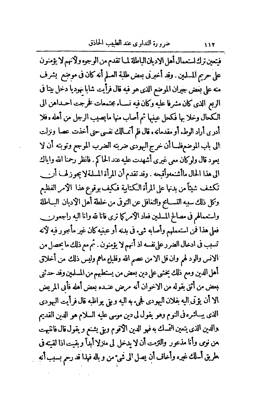 ثُمَّ مَعَ ذَلِكَ مَا يَحْصُلُ مِنْ الْأُنْسِ وَالْوُدِّ لَهُمْ، وَإِنْ قَلَّ إلَّا مَنْ عَصَمَ اللَّهُ وَقَلِيلٌ مَا هُمْ وَلَيْسَ ذَلِكَ مِنْ أَخْلَاقِ أَهْلِ الدِّينِ وَمَعَ ذَلِكَ يُخْشَى عَلَى دِينِ بَعْضِ مِنْ يَسْتَطِبُّهُمْ مِنْ الْمُسْلِمِينَ وَقَدْ حَدَّثَنِي بَعْضُ مَنْ أَثِقُ بِقَوْلِهِ مِنْ الْإِخْوَانِ أَنَّهُ مَرِضَ عِنْدَهُ بَعْضُ أَهْلِهِ فَأَبَى الْمَرِيضُ إلَّا أَنْ يُؤْتَى إلَيْهِ بِفُلَانٍ الْيَهُودِيِّ فَجِيءَ بِهِ إلَيْهِ وَبَقِيَ يُوَاظِبُهُ قَالَ: فَرَأَيْت الْيَهُودِيَّ الَّذِي يُبَاشِرُهُ فِي النَّوْمِ وَهُوَ يَقُولُ لِي: دِينُ مُوسَى - عَلَيْهِ السَّلَامُ - هُوَ الدِّينُ الْقَدِيمُ وَالدِّينُ الَّذِي يَتَعَيَّنُ التَّمَسُّكُ بِهِ فَهُوَ الدِّينُ الْأَقْوَمُ، وَبَقِيَ يُشَنِّعُ وَيَقُولُ قَالَ: فَانْتَبَهْت مِنْ نَوْمِي وَأَنَا مَذْعُورٌ وَالْتَزَمْت أَنْ لَا يَدْخُلَ لِي مَنْزِلًا أَبَدًا وَبَقِيت إذَا لَقِيته فِي طَرِيقٍ أَسْلُكُ غَيْرَهُ وَأَخَافُ أَنْ يَصِلَ إلَيَّ شَيْءٌ مِنْ وَبَالِهِ فَهَذَا قَدْ رُحِمَ بِسَبَبِ أَنَّهُ